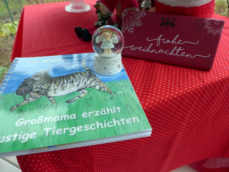 Von Monika, die mir das Paket geschickt hat, bekam ich noch liebevoll ausgesuchte Extras: das Buch von Uta Winkler "Großmama erzählt Lustige Tiergeschichten", was sie zusammen mit der Autorin auf den verlegerischen Weg gebracht hat, eine Schokolade und einen Glücksbringer in Form eines kleinen Engels in einer Schneekugel. Alles ganz ganz liebevoll ausgesucht und wirklich zauberhaft. Das wärmt meine Seele :-) Danke, liebe Monika!