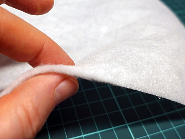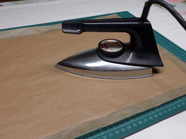 Die beiden Stoffe habe ich dann zusammengebügelt. Die Klebeseite von dem Vlies muss auf die Unterseite von dem Korkstoff treffen. Da der Korkstoff etwas dicker ist, musste ich das Bügeleisen länger auf einer Stelle stehenlassen, damit die Klebepunkte vom Vlies ganzflächig schmelzen.