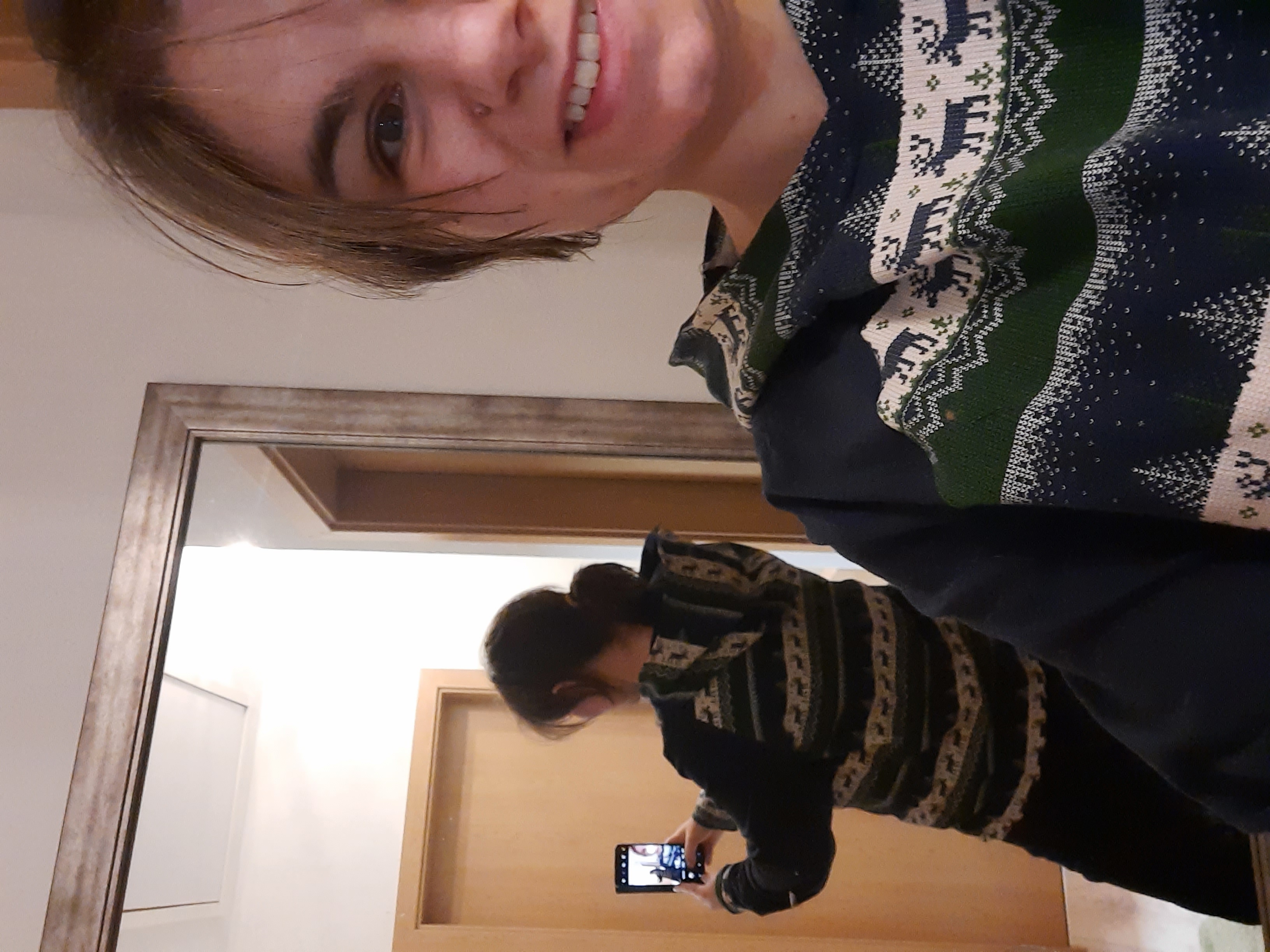Den bekommt er aber schon vorab zum Geburtstag am 10. Dezember, dass er ihn auch in der Weihnachtszeit noch etwas tragen kann. (Nicht wundern - ein "Selfie" von mir, nachts um 2 oder so entstanden, als der Pulli dann fertig wurde :D)