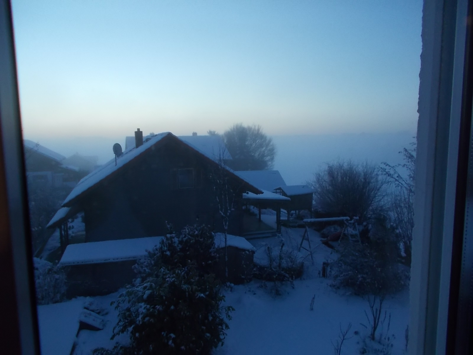 Da gebe ich euch ein weiteres Winterbild dazu - heute morgen kurz vor Sonnenaufgang aus unserem Fenster gemacht. Es lag leichter eisiger Nebel über dem Land. Das sah richtig märchenhaft aus.