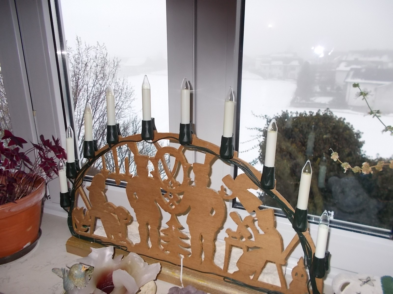 Hier unser handgeschnitzter Schwibbogen, den wir vor vielen Jahren geschenkt bekamen und der uns Jahr für Jahr begleitet.