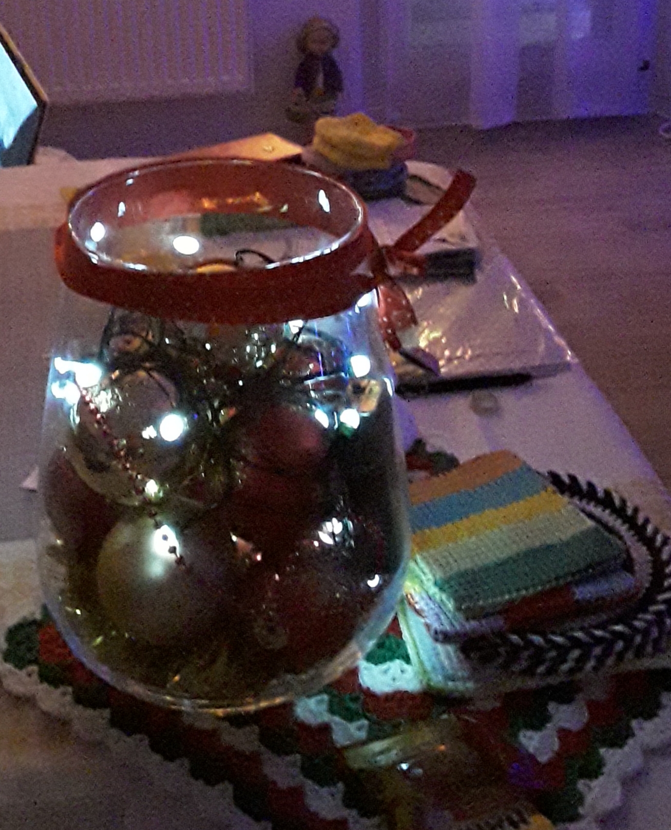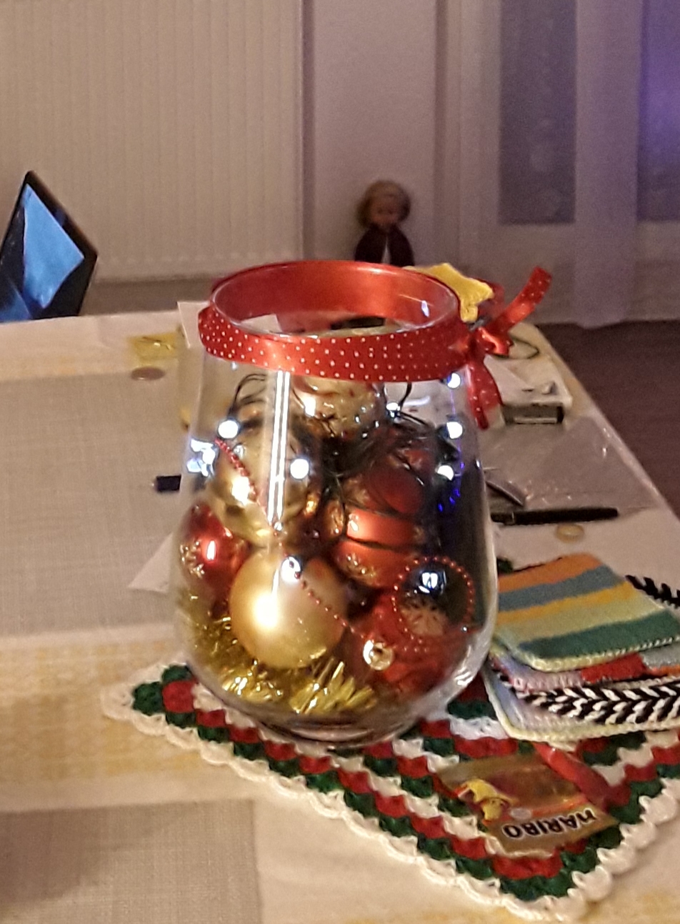 Das ist diesmal meine Deko, ein Teil davon. Grosses Glas mit Kugeln und Lamettaschlange drin, und kleine LED-Lichterkette