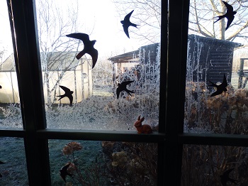 Heute haben wir knackige 11° minus und die Sonne lacht.  Auf der Terrasse gibt es sogar Eisblumen.