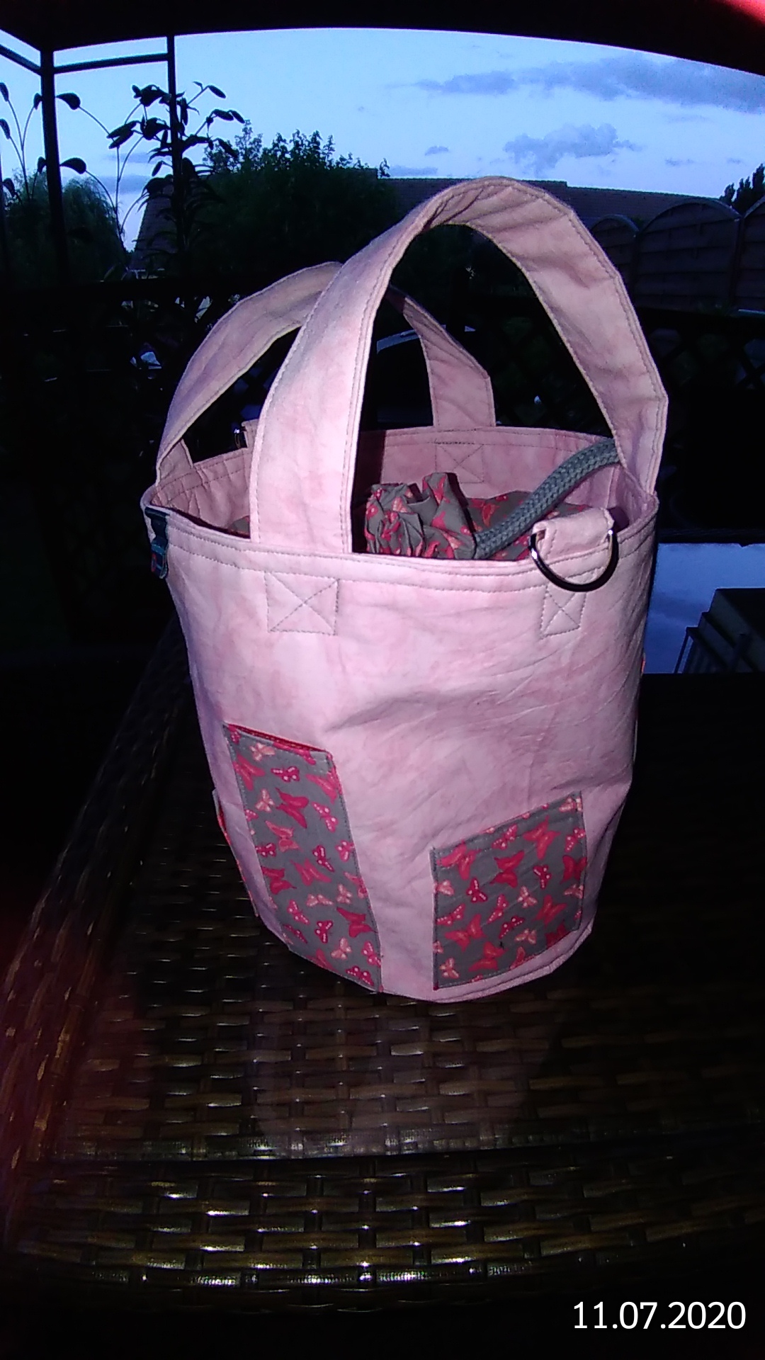 Das ist ein Stricktasche. Das aktuelle Werkstück kommt in die Haupttasche und in die Außentaschen, was man noch so an Zubehör braucht.