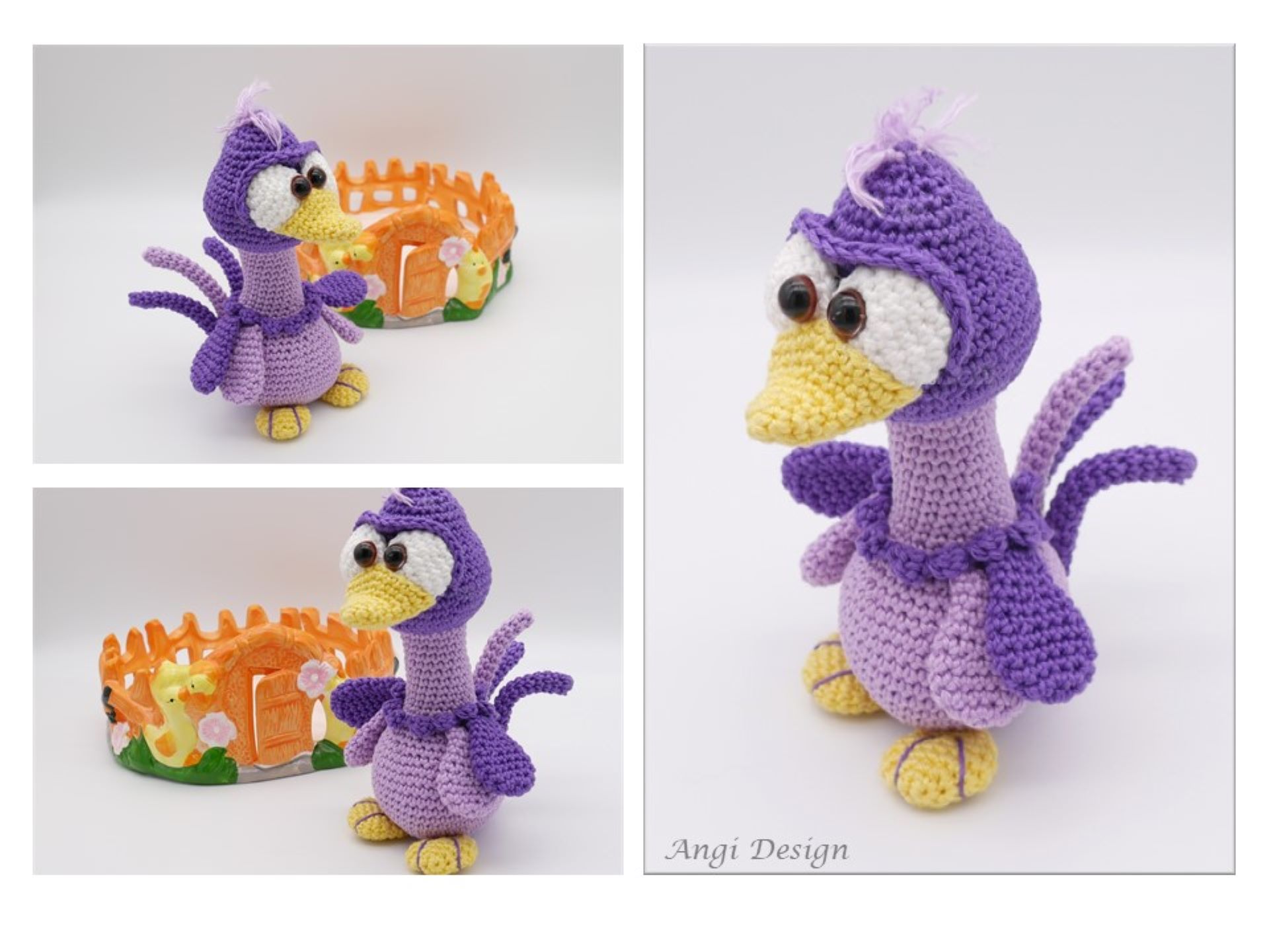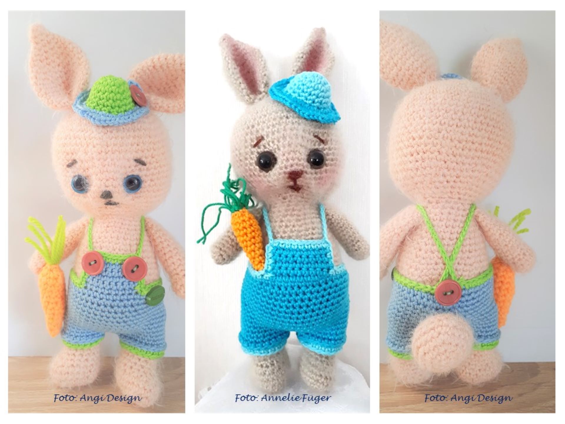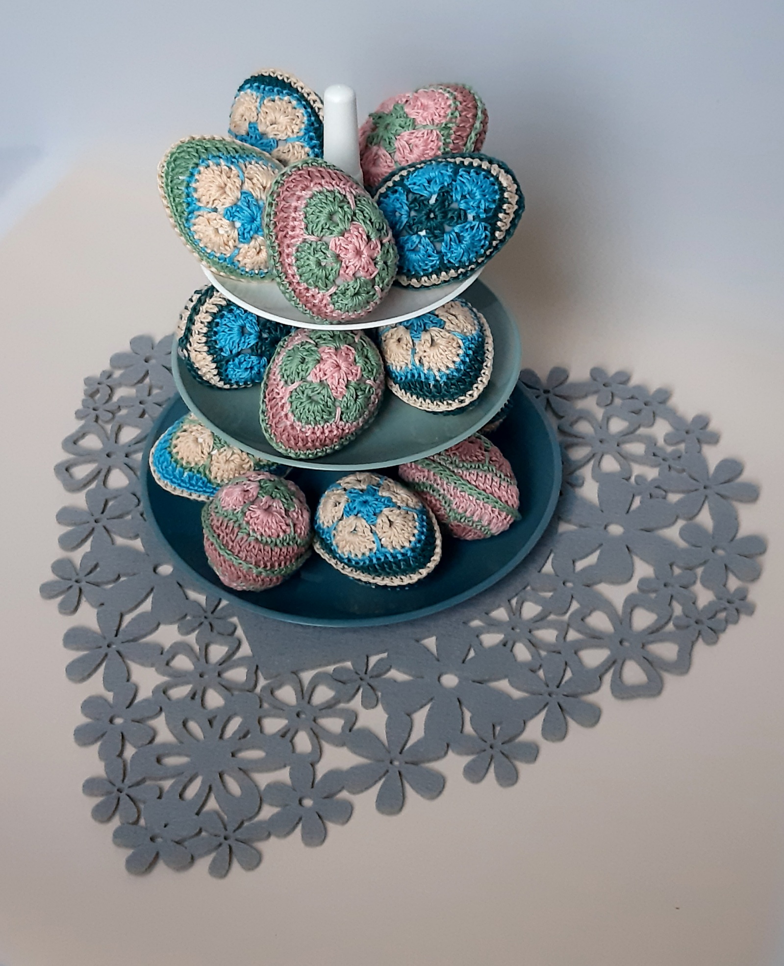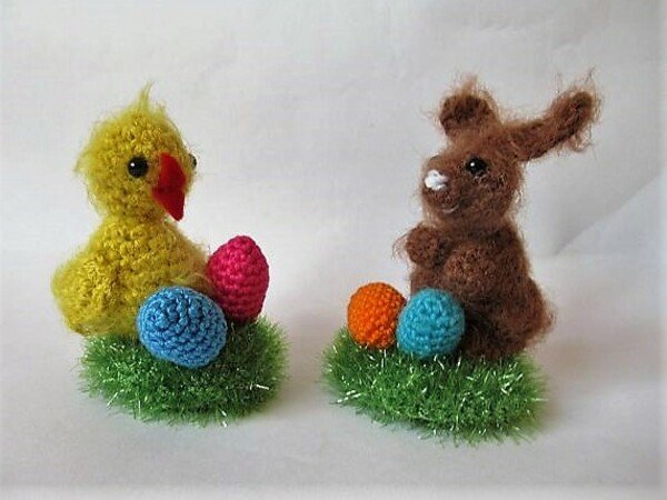 Eine kleine , feine Osterdekoration, die du aus kleinsten Resten von buntem Garn nachhäkeln kannst. Das Küken und der Osterhase sind etwa 8 cm hoch, das grüne Rasenstück (hier aus Schwammgarn gehäkelt) hat einen Durchmesser von etwa 5 cm.