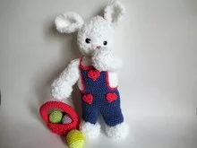 Hasen Purzelausprobieren.Auch hier wird mit unterschiedlichem Garn gehäkelt: Die Hose und der Korb sind aus Baumwollgarn, der Körper des Hasen aus Plüschwolle. Hier habe ich einen weißen Baumwollfaden (Filetgarn) mitverhäkelt. Dadurch erkennt man ganz gut die Maschen, und kann sie auch erfühlen.