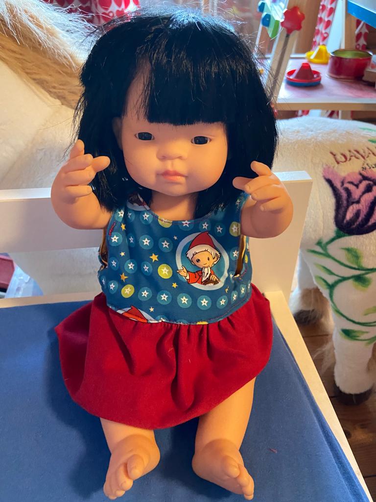 Hier ein paar Puppenkleider   die ich für meine Enkel genäht habe.  Die letzten zwei Bilder zeigen ein Wendekleid.