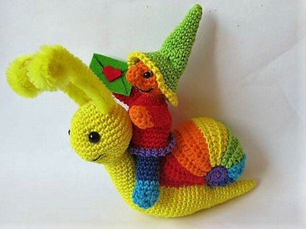 Wartest du auch manchmal auf Post, die ewig lange unterwegs ist? Statt dich über die zögerliche Zustellung zu ärgern, solltest du lieber diese witzige Schneckenpost häkeln! Um den Wichtel Willi und seine Rennschnecke Billi nachzuarbeiten brauchst du von dem gelben Baumwollgarn ein halbes Knäuel, von den anderen Farben genügen kleine Reste.