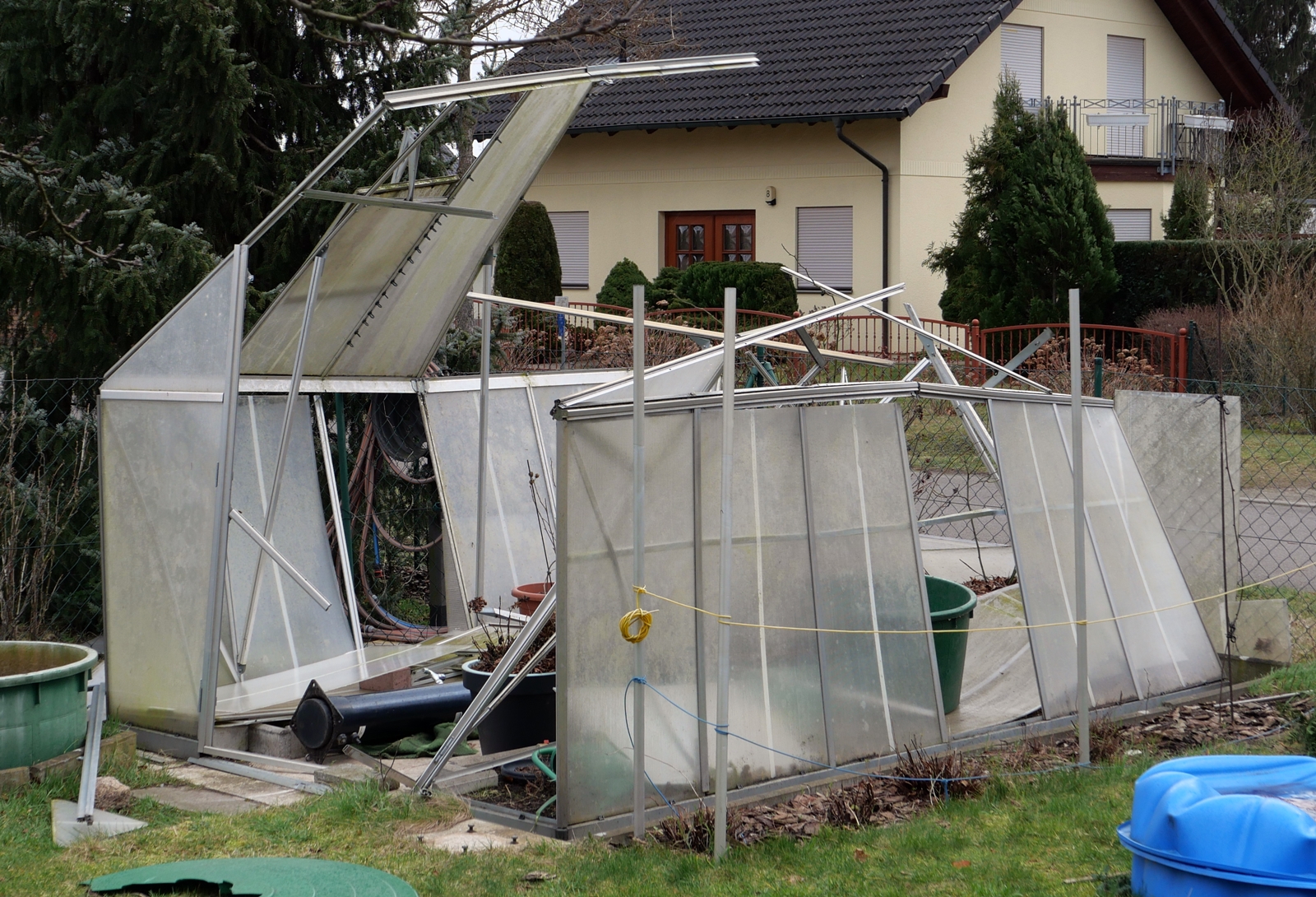 Wir haben leider ein total zerstörtes Gewächshaus zu beklagen. Das hatte ich meinem Mann vor 5 Jahren zum Eintritt in die vorzeitige Rente geschenkt. In jedem Jahr hat es uns Unmengen von Gurken, Salaten und Kräutern geschenkt. Nun ist es total kaputt und nicht mehr reparabel. .