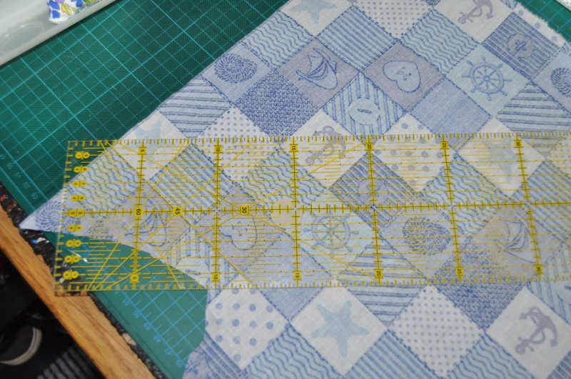 Patchworklineal, das legt man so auf seinen Stoff das die 45° Linie so