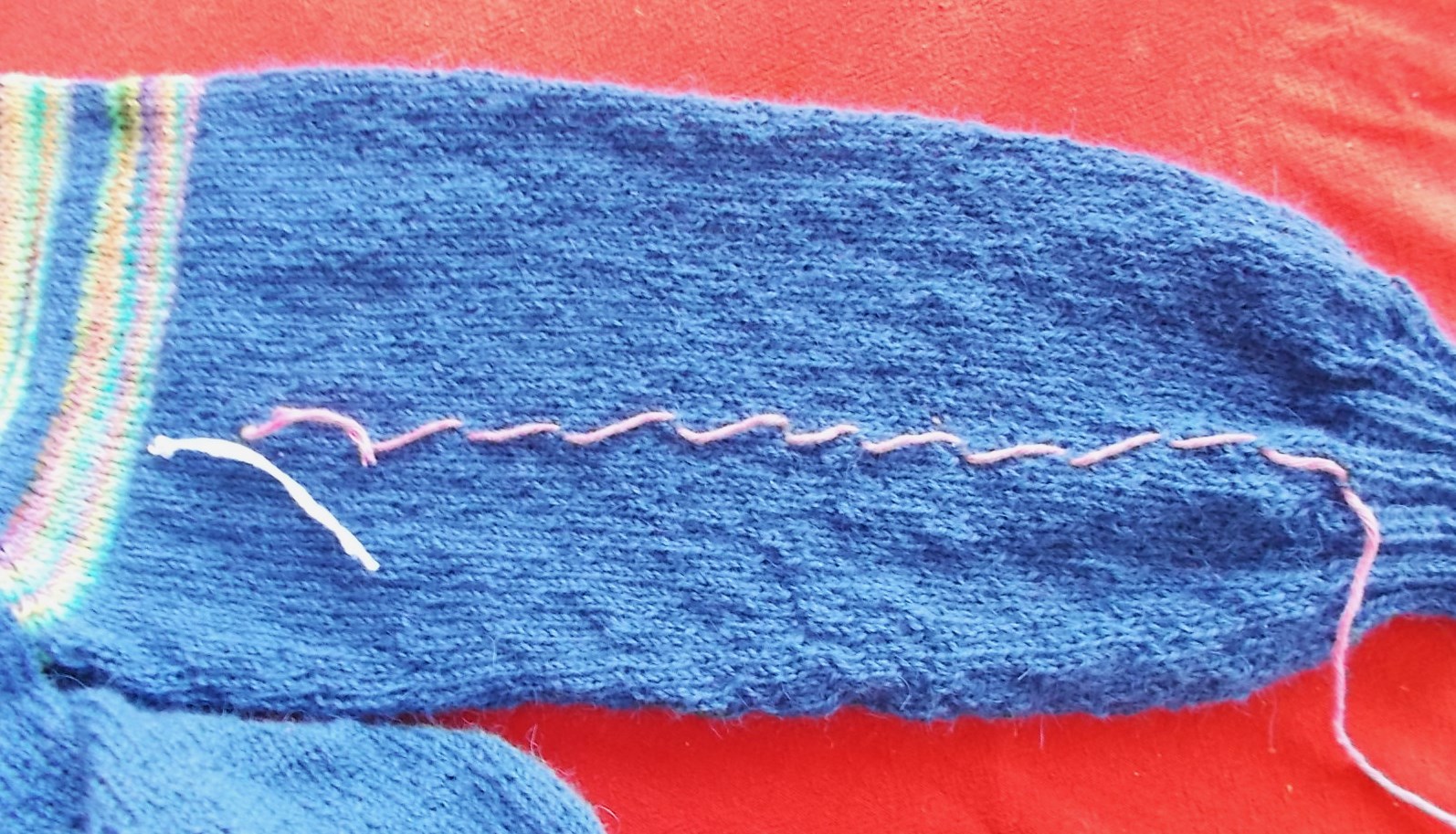 Und bei Tüchern wenn man die Mitte braucht, lass ich auch einen Faden mitlaufen, sodass ich nicht "schief" werde, sieht fast so aus wie Monikas Markierungen für die Reihen 😉