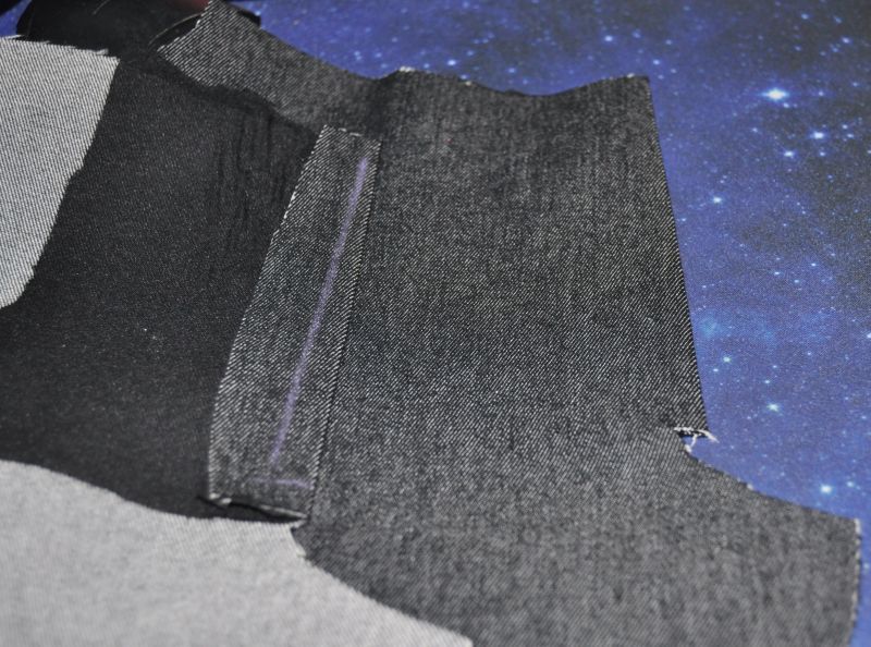 der Obertritt das ist das Teil das man dann wenn man von vorne auf die Hose schaut auch teilweise sieht. Meist ist der am Schnitt mit angezeichnet und wird entsprechend zugeschnitten, und dann mit einem Bügelvlies abgegbügelt, ergibt den Stand.Der Kreidestrich zeigt an wo der RV angenäht wird, der Obertrit wird an beoiden Hosenteilen so umgebügelt das unten an der Schrittnaht er ca 1cm vorsteht, dieser cm ist wichtig später beim zusammen nähen der Hose.
