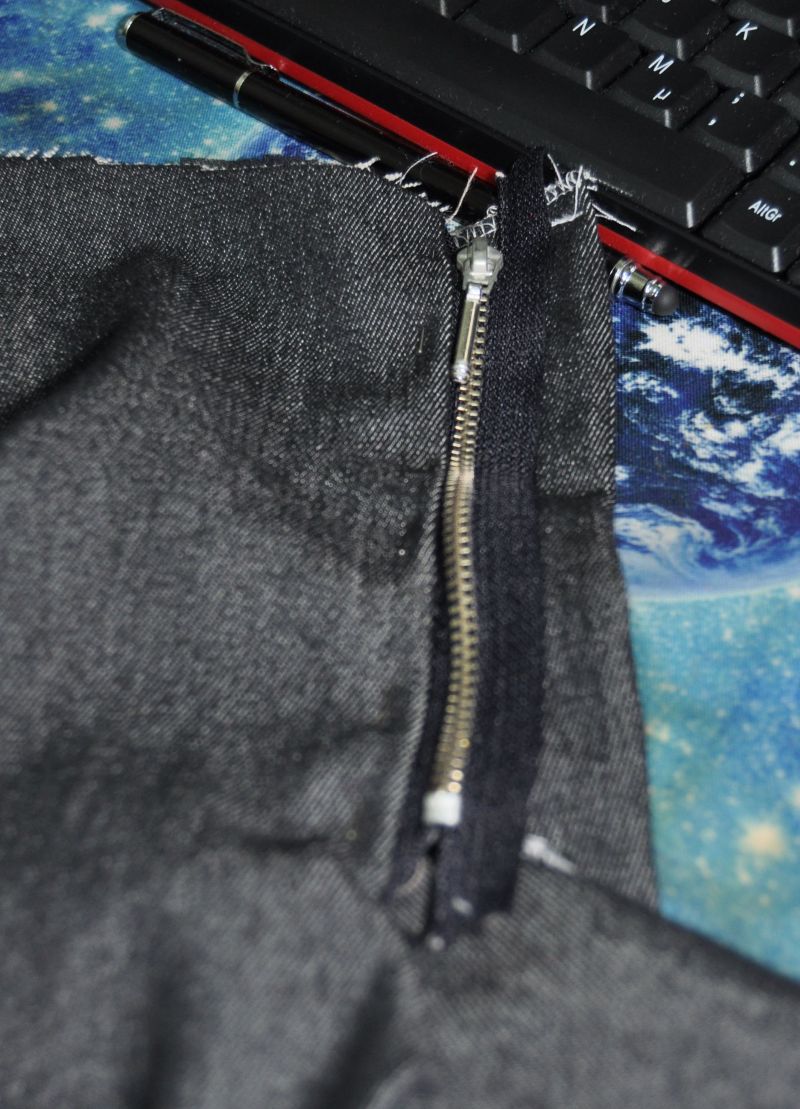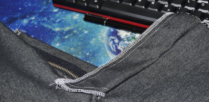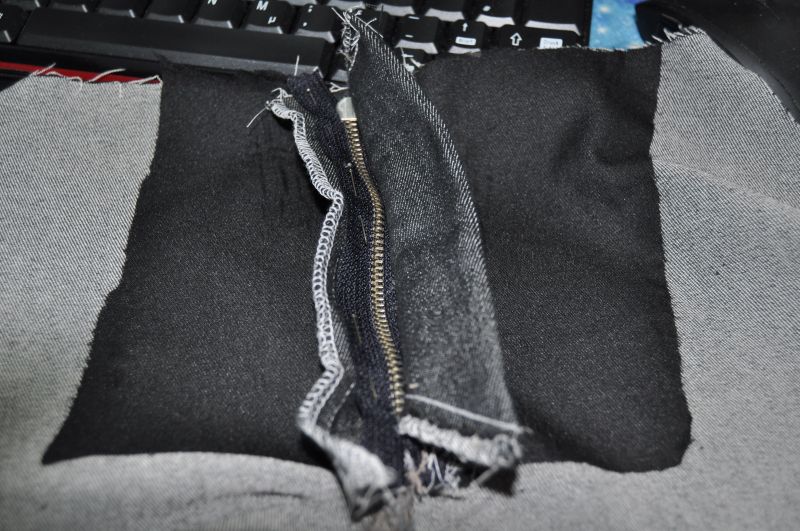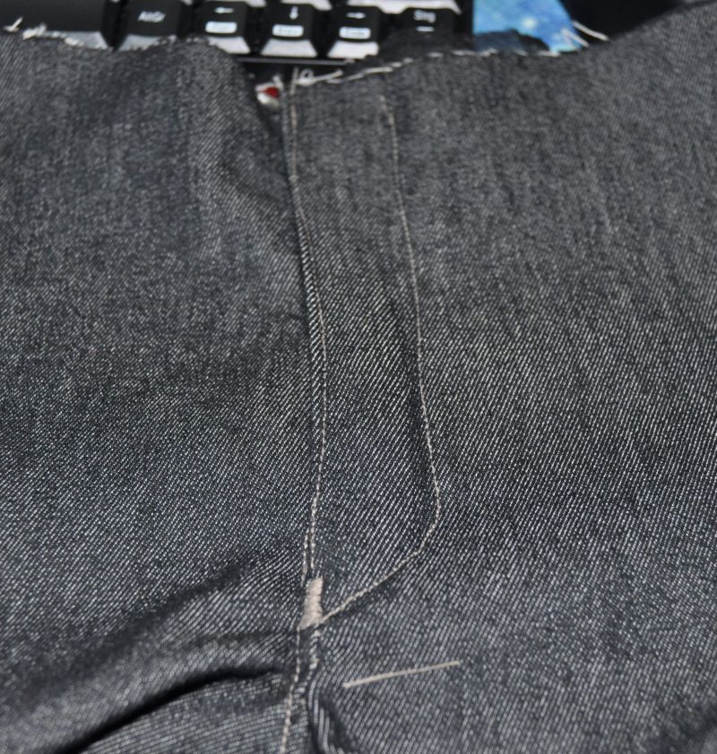 wenn der RV auf den Untertritt genäht wurde wird das ganze an der rechten Vorderhose bei Herrenhosen am Obertritt so angenäht das man die Raupe gerade sieht wie auf dem Bild, das gelingt am besten mit einem RVFuß oder wenn man die Nadel an der Nähmaschine so weit verschieben kann das man ihn knappkantig annähen kann.