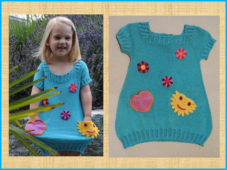 Dieses süße Ballonkleid sieht in Türkis richtig frühlingsfrisch aus! Es wird in RVO gestrickt, dadurch kann es in der Größe leicht angepasst werden. Die Applikationen werden gehäkelt und anschließend aufgenäht.