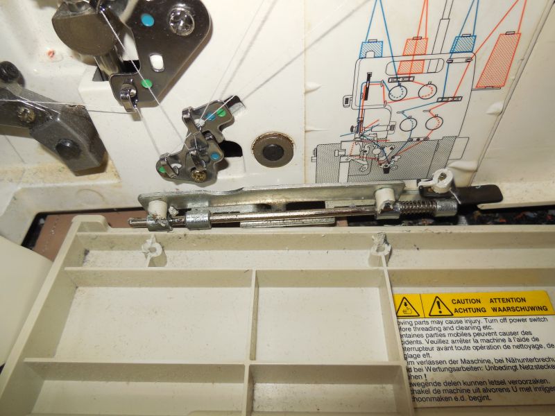 schau mal das ist eine Aufnahme von meiner Ovi, da siehst diese bleuen und grünen Farbpunkte, so ist gekennzeichnet wie man welchen Faden wo einfädeln muss. Das Bild machte mein Mann weil da meine Schutzklappe mal abgebrochen war, damit er sehen konnte wie er es reparieren kann. Daneben sieht man auch die Schemazeichnung wie welcher Faden laufen muss/soll.