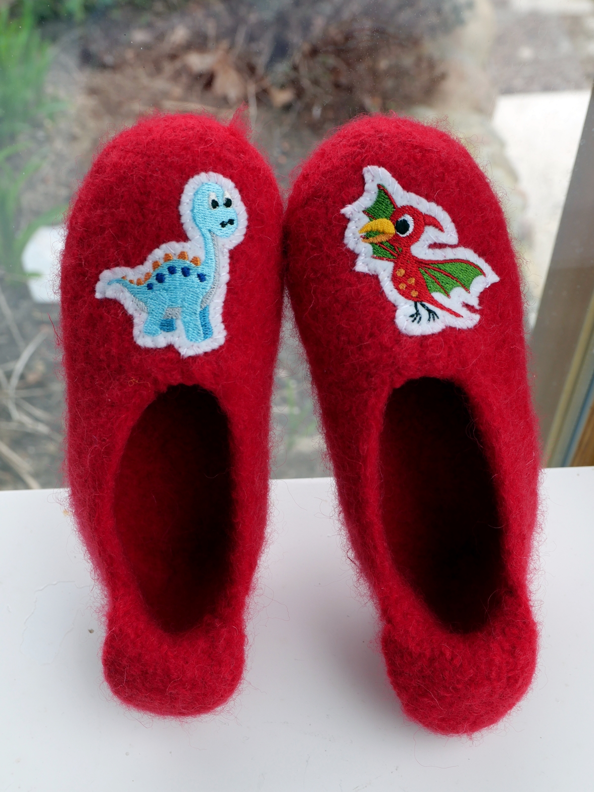 die Füße meiner Enkel wachsen schnell und so wurde ich gebeten, wieder mal 2 Paar neue Hausschuhe zu fertigen: für die Kita und für Zuhause. Und weil mein Enkel Oskar derzeit total auf Dinos steht, wünschte er sich diese. Und die Schuhe sollten unbedingt feuerwehrrot sein. Bitteschön, hier kommt das erste Paar in der gewünschdten Konstellation. Natürlich rutschfest und hinten mit Anfasser.