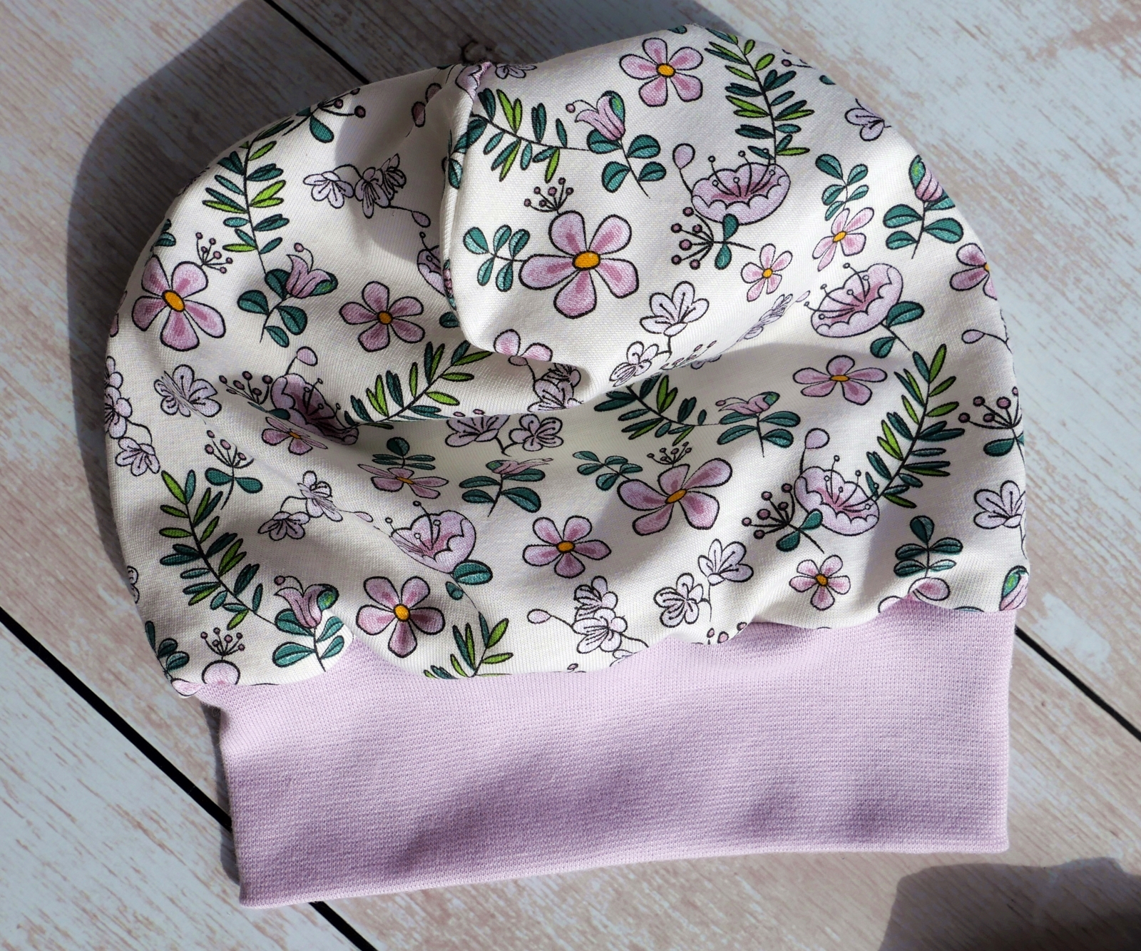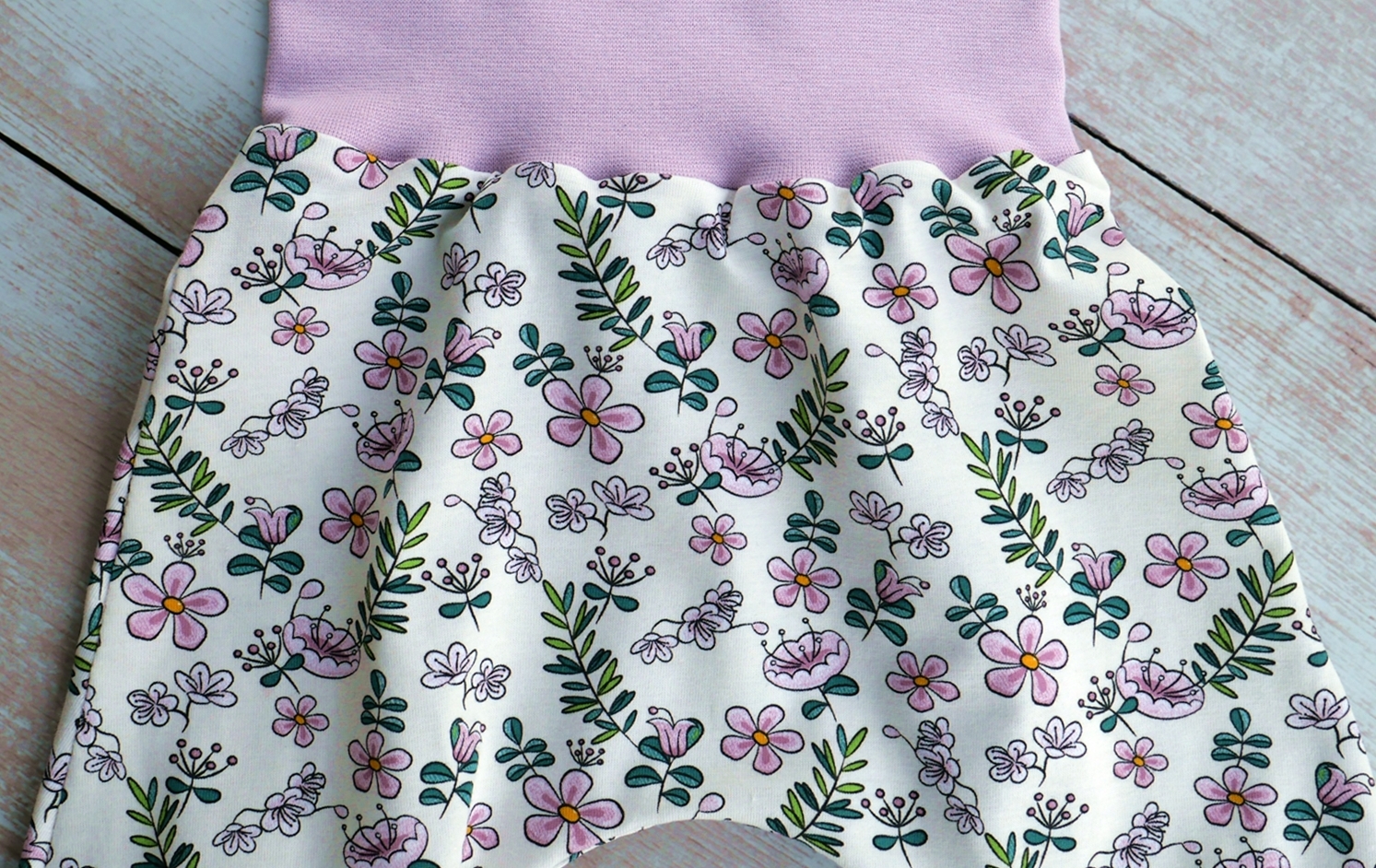 Das kleine Blümchenmuster eignet sich sehr gut für Babysachen, weil viel vom Muster zu sehen ist. Also merke: Für Babysachen vorzugsweise kleingemusterte Stoffe wählen! Dazu ein Bündchen in passender Farbe. Als Bündchenfarbe hätte ich noch diese hellen Grundton des Stoffes gehabt, aber das hatte mir zu wenig Kontrast. Ich finde, Babys sollen ruhig ein bisschen Farbe tragen.