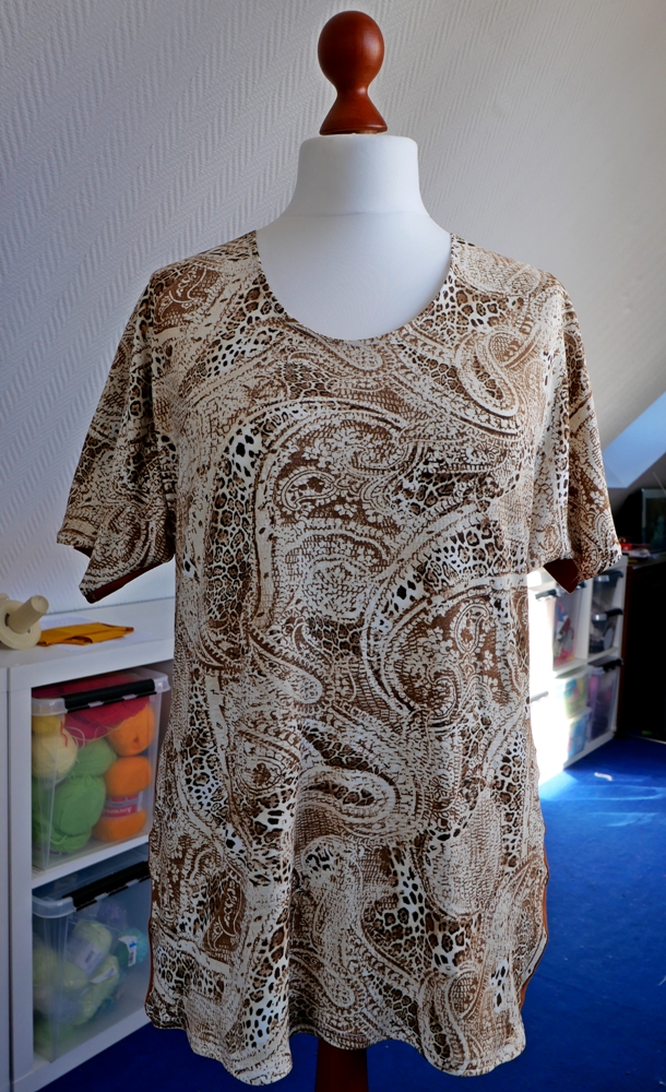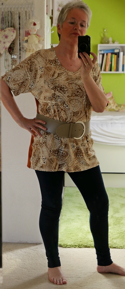 Am Ende kam dann das heraus. Ich habe mich gewundert, warum das Rückenteil unten breiter ist als das Vorderteil. Das war auf dem Schnitt so angegeben und ich ließ es so. Die meisten Damen haben bestimmt hier einen "Mehrbedarf" an Stoff. Ich nicht. Deshalb werde ich das Rückenteil hier noch für mich anpassen und genauso breit wie das Vorderteil machen.