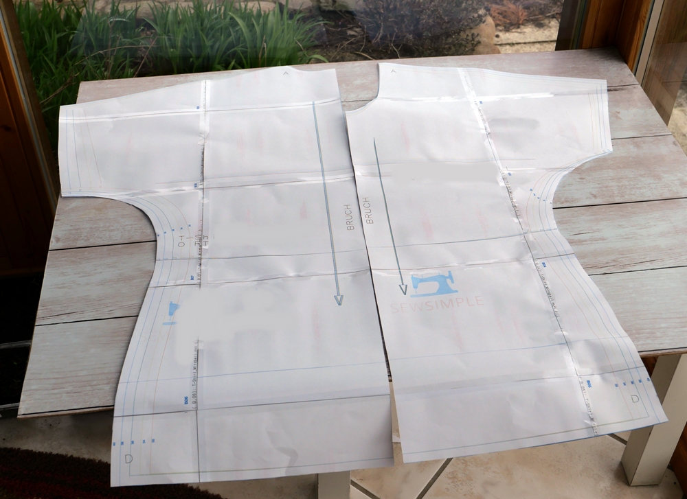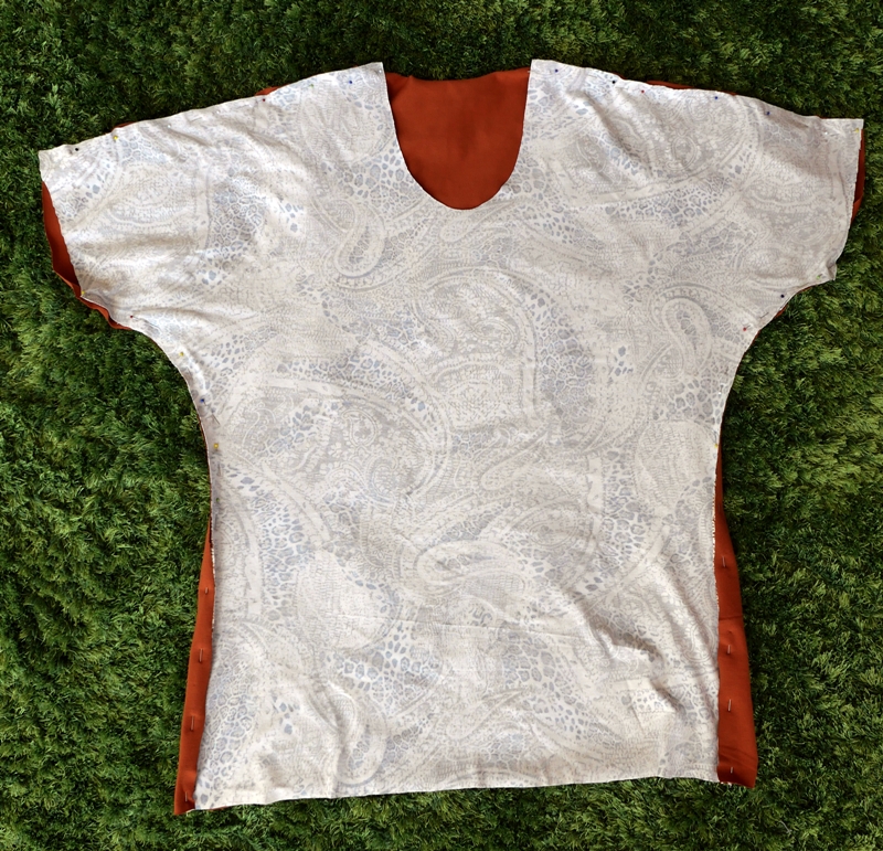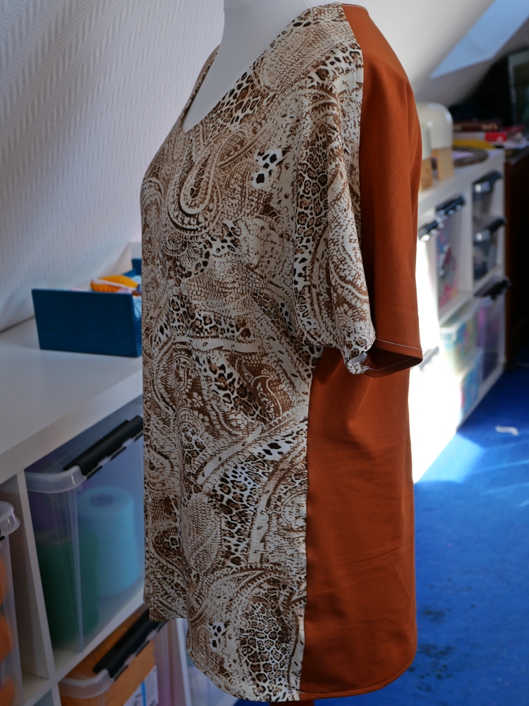 Danach habe ich die Stoffzuschnitte auch korrgiert. Die beiden Teile habe ich dann zusammengenäht. Da Jersey elastisch ist, konnte ich auf Brustabnäher verzichten (das wäre für mich auch zu kompliziert gewesen). Ich wollte, dass es insgesamt locker, aber figurbetont und tailliert sitzt.