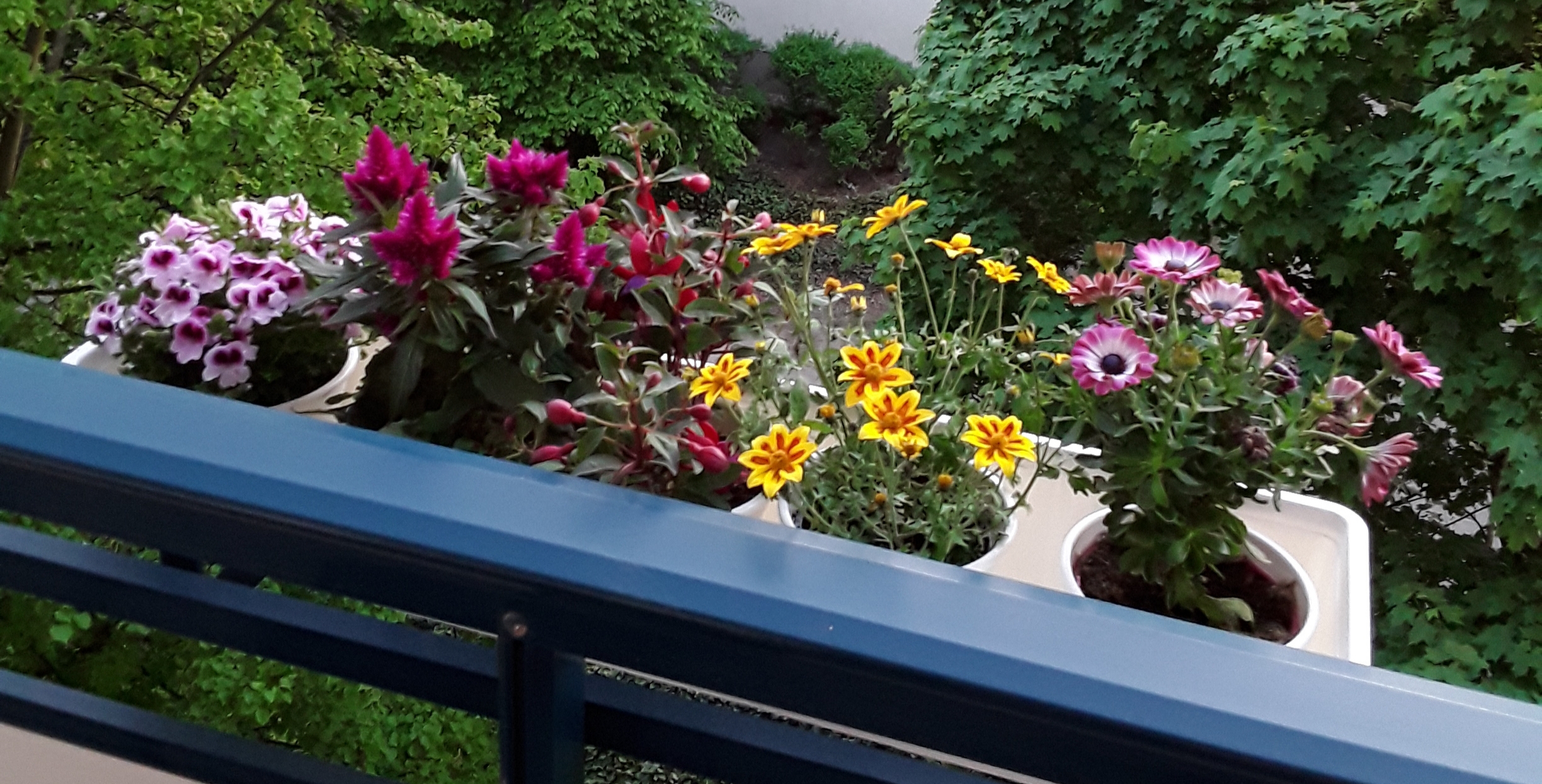 Ich frage mich nur, warum Du die Blumen in Töpfen in den Balkonkasten gestellt hast. Die Pflanzen hätten doch viel mehr Erde und Nährstoffe, wenn Du sie direkt in die Balkonkästen pflanzt.