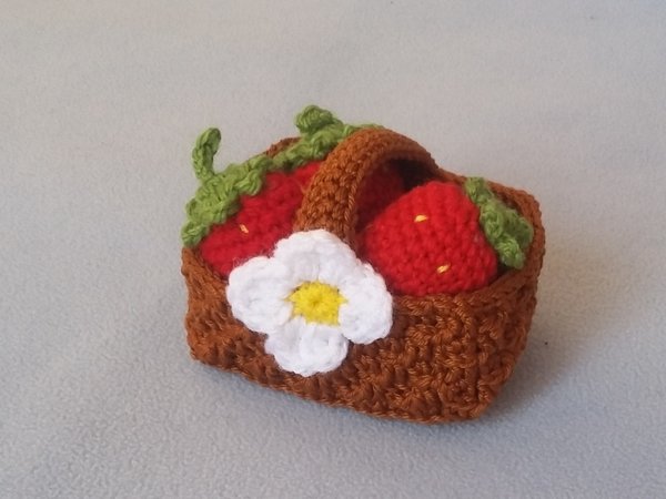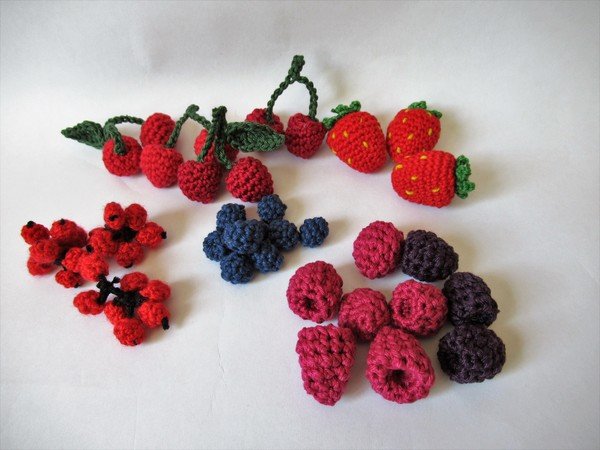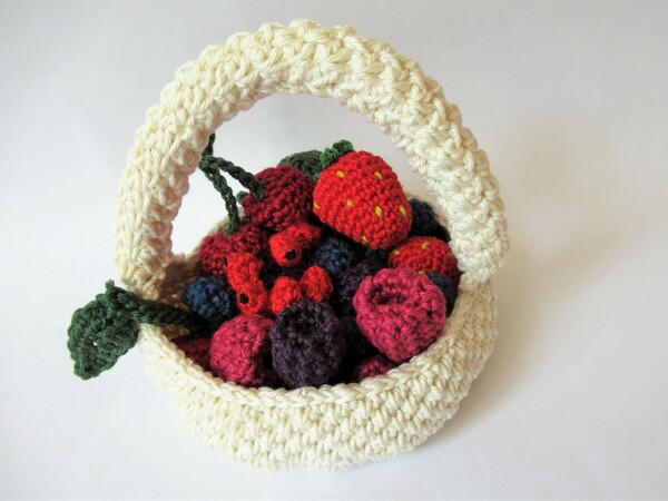 Beerenkörbchen findet man 5 verschiedene gehäkelte Beeresorten: Erdbeeren, Johannisbeeren, Kirschen, Himbeeren, Blaubeeren und Brombeeren. Dafür kannst du ganz einfach vorhandene Wollreste verwenden - und die Beerenabteilung des Kinderkaufladens ist reich bestückt.