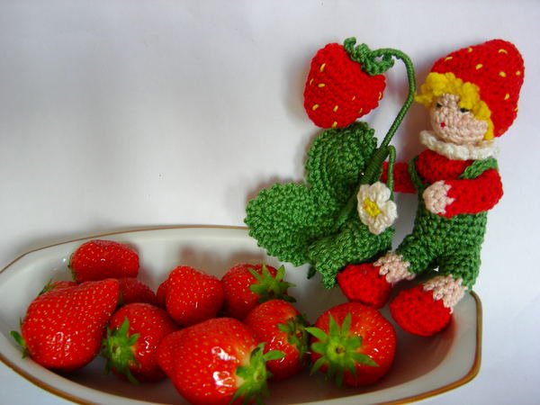 Blumenkind Erdbeere , ein etwa 12 cm großes, gehäkeltes Püppchen, ist eine süße Dekoration für den Jahreszeitentisch oder den Kaffeetisch in der Erdbeerzeit. Auch hier lassen sich wunderbar Wollreste verarbeiten.