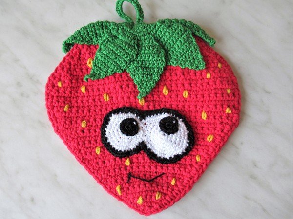 Erdbeer- Topflappen von der Wand und macht gute Laune!