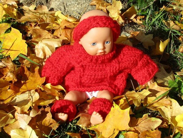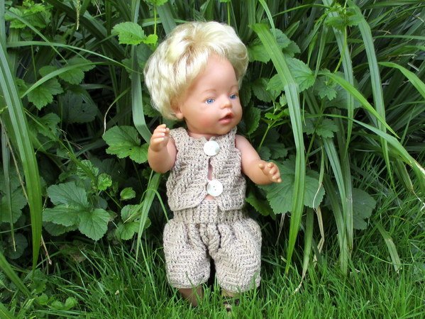 Die Puppenkleidung ist aus Reliefstäbchen gehäkelt.