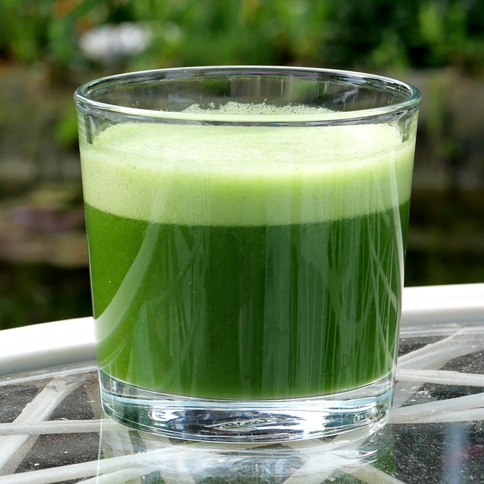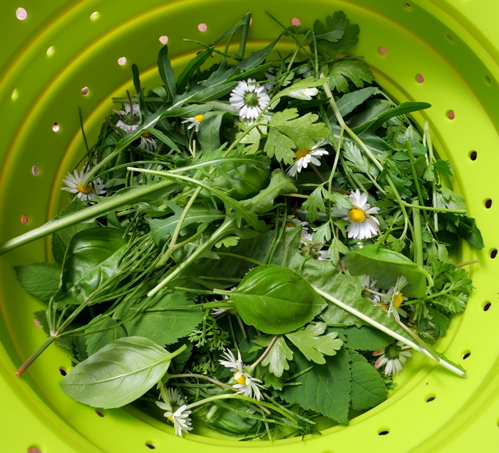 seitdem draußen wieder alles wächst, haben wir uns einen täglichen Smootie aus Gartenkräutern angewöhnt. Da gehe ich dann mit meinem Durchschlag durch den Garten und pflücke Unkräuter: Ruccola, Bärlauch, Löwenzahn, Gänseblümchen, Giersch, Brennessel, Ackerschachtelhalm, Petersilie, Basilikum ... alles, was ich kenne halt. Das wird dann unter fließendem Wasser gründlich gewaschen und kommt in meinen Mixer. Dazu noch ein paar Scheiben Ingwer für die Schärfe, Saft von einer Zitrone für die Frische, 1 Banane oder Birne für die Süße und kaltes Wasser.