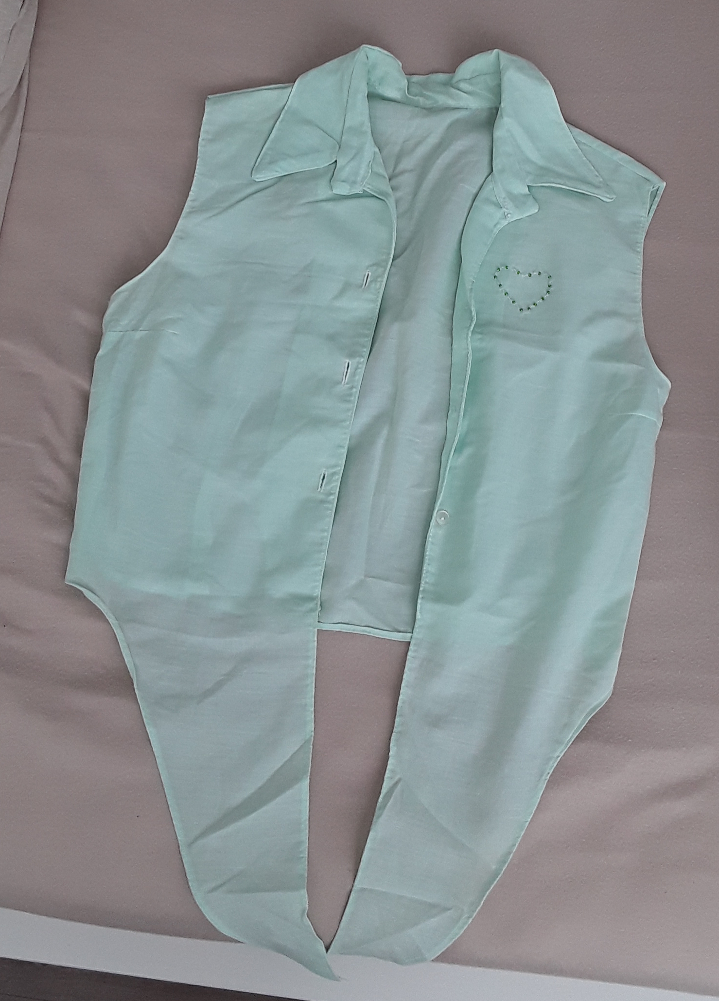 Vor einigen Jahren habe ich mir aus einem alten Bw-Nachthemd eine neckische Bluse genäht, ohne Ärmel, sogar mit Knopflöcher, und vorne zum Binden, aus Perlen ein Herz aufgestickt. Such ich mal raus (Bild kommt)