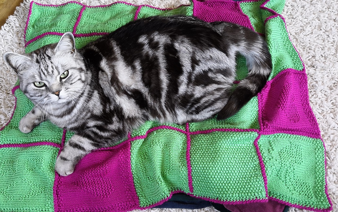 Vor kurzem habe ich unserem Kater Lino eine Decke "geschenkt", sogar mit seinem Namen. Auch da war es eher ein Geschenk an mich :-) Er liegt nämlich mit Vorliebe auf irgendwelchen weichen Sachen, bevorzugt auf frisch gewaschener Kleidung (die darauf wartet, zusammengelegt zu werden), und haart dann alles furchtbar ein. Nun hoffe ich, dass er öfters mal seine Decke verhaart statt unsere Sachen ;-) Die Anleitung für die Squares, mit der man so eine Decke stricken kann, gibt es hier.