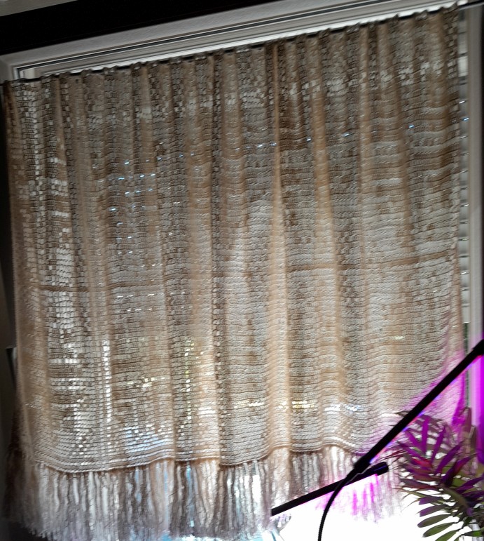 diese Gardine hat mir mal meine jüngste Tochter zu einem Geburtstag gehäkelt, ich liebe dies gardine gerade im Sommer, das sie etwas besser als leichte weiße die Sonne draußen halten