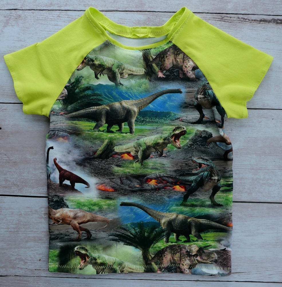 Das Dino-Shirt war mein erstes T-Shirt. Daher sehe ich natürlich Verbesserungsbedarf. Bei nächsten will ich unbedingt ein Halsbündchen hinkriegen, das hinten keine Naht hat. Und ich habe in der Zwischenzeit gelernt, dass bei "zusammengesetzten" Sachen die Qualität der Stoffe gleich sein muss. Hier war der Dino-Stoff toll, aber das neongrüne war zu labberig. Am Ende trägt er es so oder so, aber mein Anspruch an Nähkünste wächst ja von Werk zu Werk.