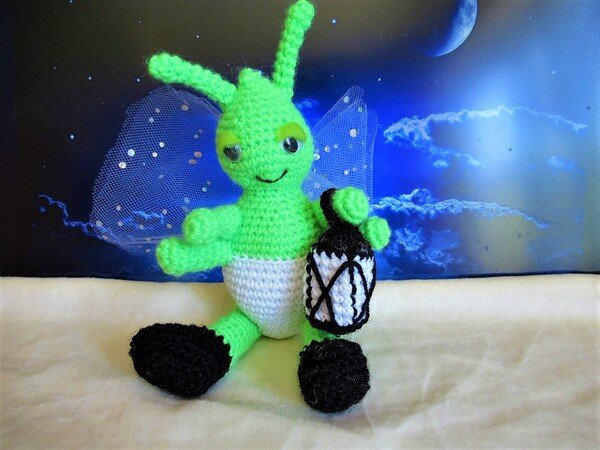 Glühwürmchen Günther. Für den Unterkörper von Günther habe ich nachtleuchtendes Garn verwendet.Wenn man es einige Zeit an einer Lichtquelle auflädt, leuchtet es im Dunkeln. Günther wird etwa 20 cm groß und ist nicht schwer nachzuhäkeln.