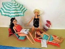 6-teilige Strandset: Sonnenschirm, Luftmatratze, Handtuch, Badeanzug, Strohhut und Badetasche. Das alles kannst du aus Wollresten häkeln.