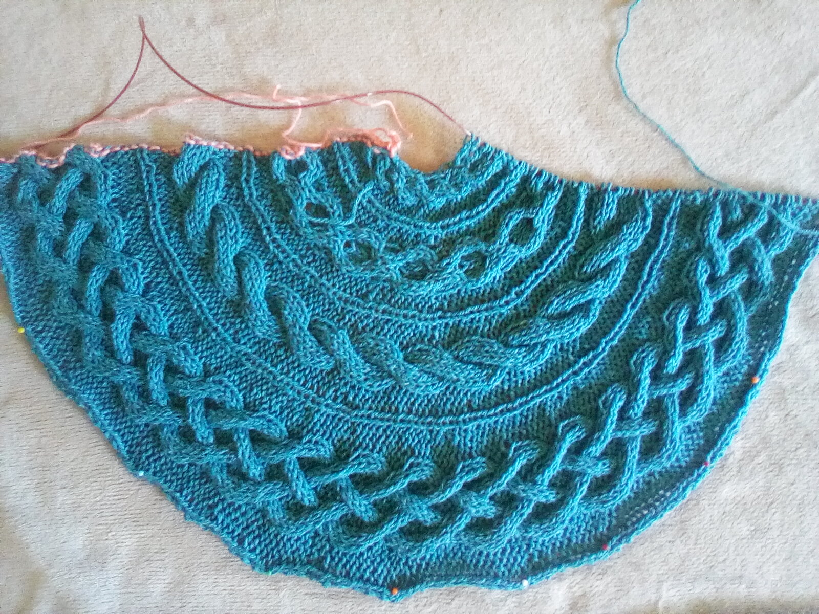 Im Moment stricke ich einen Kreis.... Aber nicht in der Runde, sondern in Hin und Rückreihen... mit verkürzten Reihen und Zopfmuster....