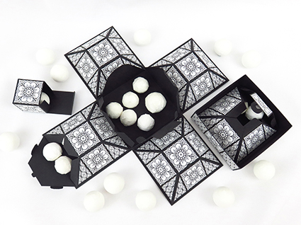 Die Box ist aus Fotokarton gefertigt und mit Motivpapier dekoriert (das Motiv, das ich verwendet habe, kannst du zusammen mit der Anleitung herunterladen). Sie ist ca. 10 x 10 cm groß und für geübte Bastler leicht nachzuarbeiten.