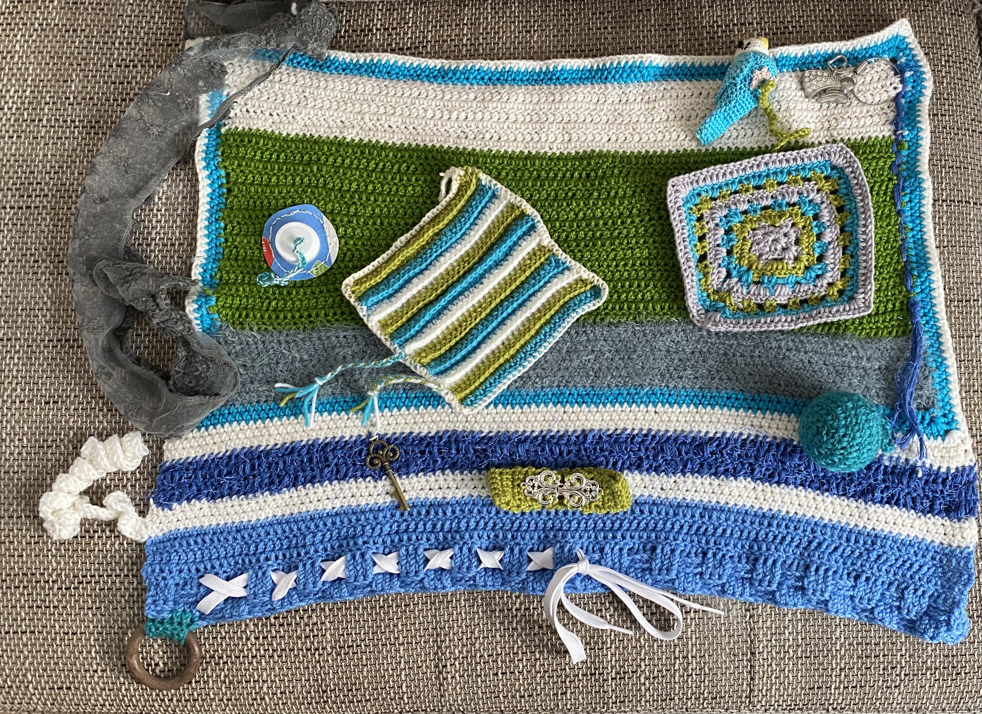 Es gibt hier eine Grannytasche in der ein Wellensittich wohnt, ein Mini Gürtel mit Schnalle, einen Rasselball, einen strukturierten ToLa, einen Schlüssel, einen Tetrapackverschluss zum Aufdrehen, einen Ring, ein Drehwürmchen am Rand, Spitzenstoff zum Zuppeln, Schnürsenkel zum Schleifebinden und einen Schutzengelanhänger aus Metall.