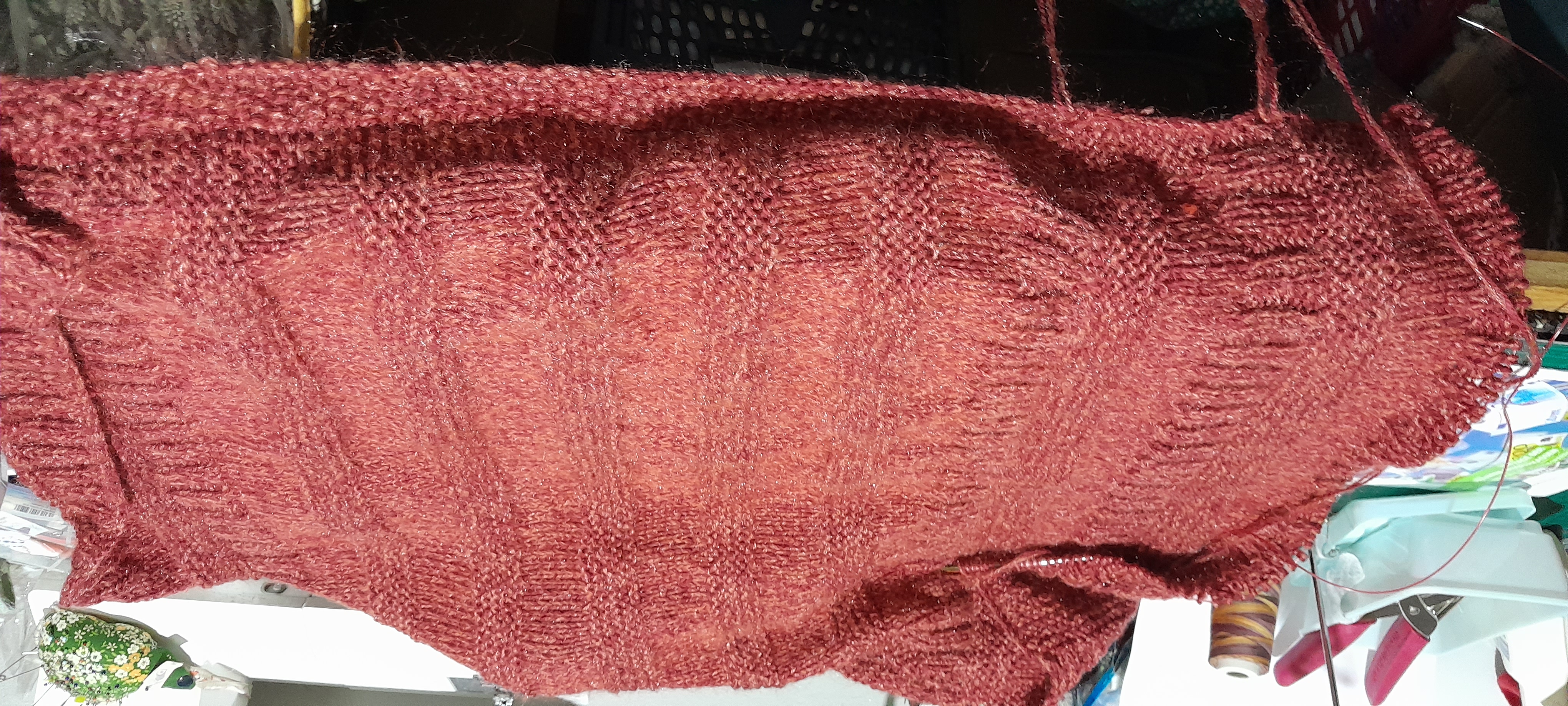 bin ja immer noch an meinem Seelenwärmer, hab mal ein Bild gemacht wie weit ich jetzt bin, wenn der Rapport an dem ich grad stricke fertig ist, muss genau so einer noch an die andere Seite ran, dann hat es die gewünschte weite die ich brauche, dann kommen noch Ärmel ran und ein Krangen so wie Bündchen unten rum, denn es sollein richtig kuscheliger Seelenwärmer werden