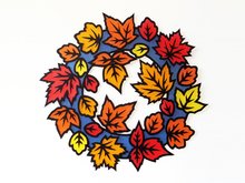 Der Herbstkranz ist aus Fotokarton sowie Transparentpapier gefertigt, ca. 46 x 46 cm groß und einfach zu basteln. Außer dem geübten Umgang mit einem Cutter werden dafür keine besonderen Fähigkeiten benötigt.