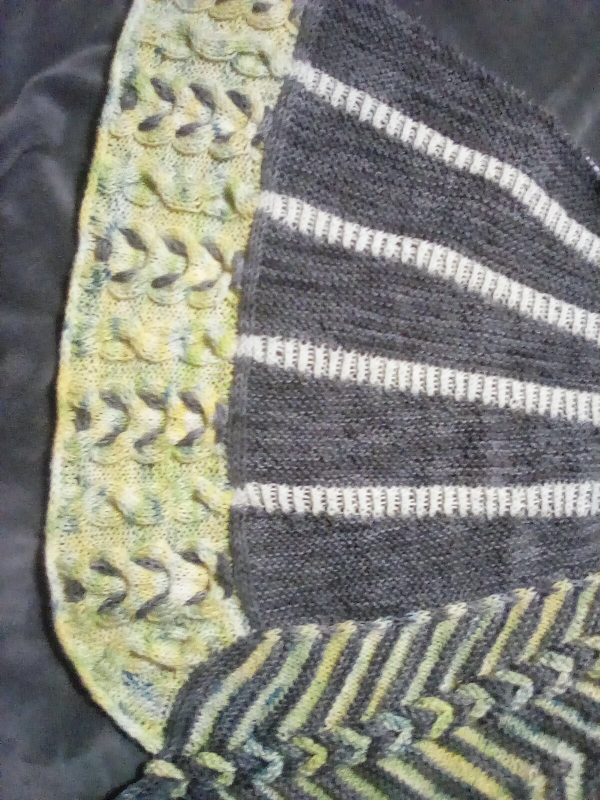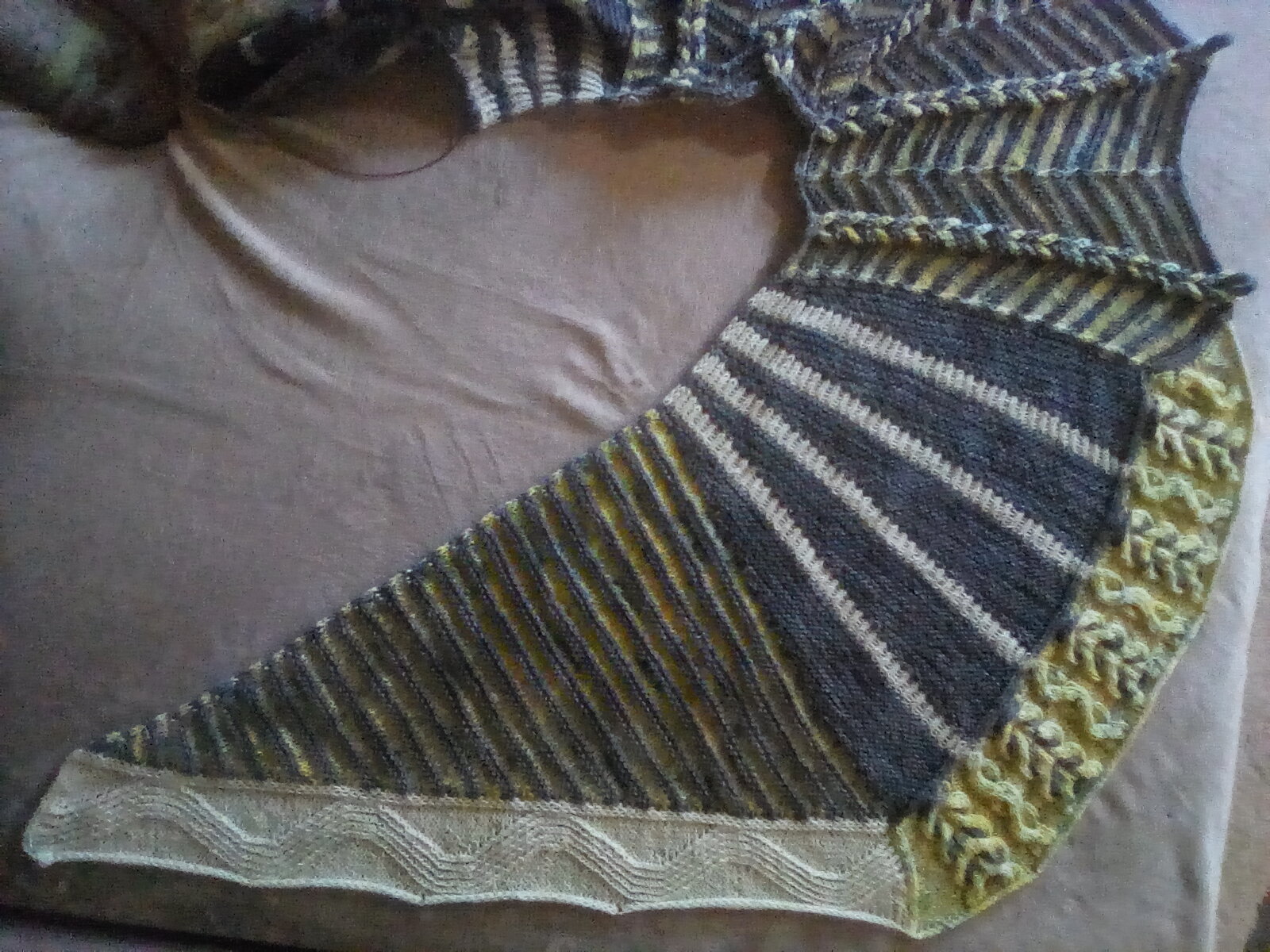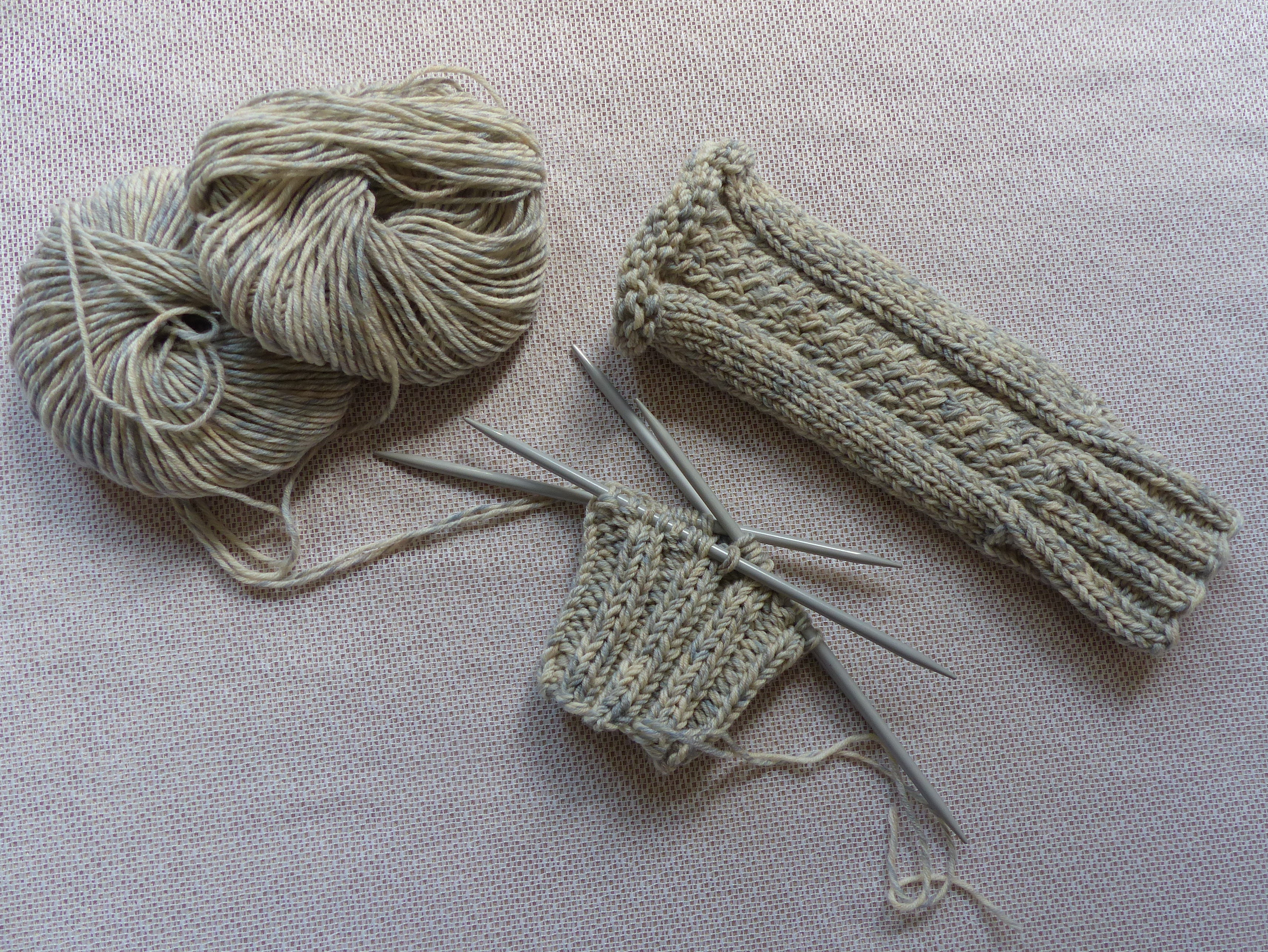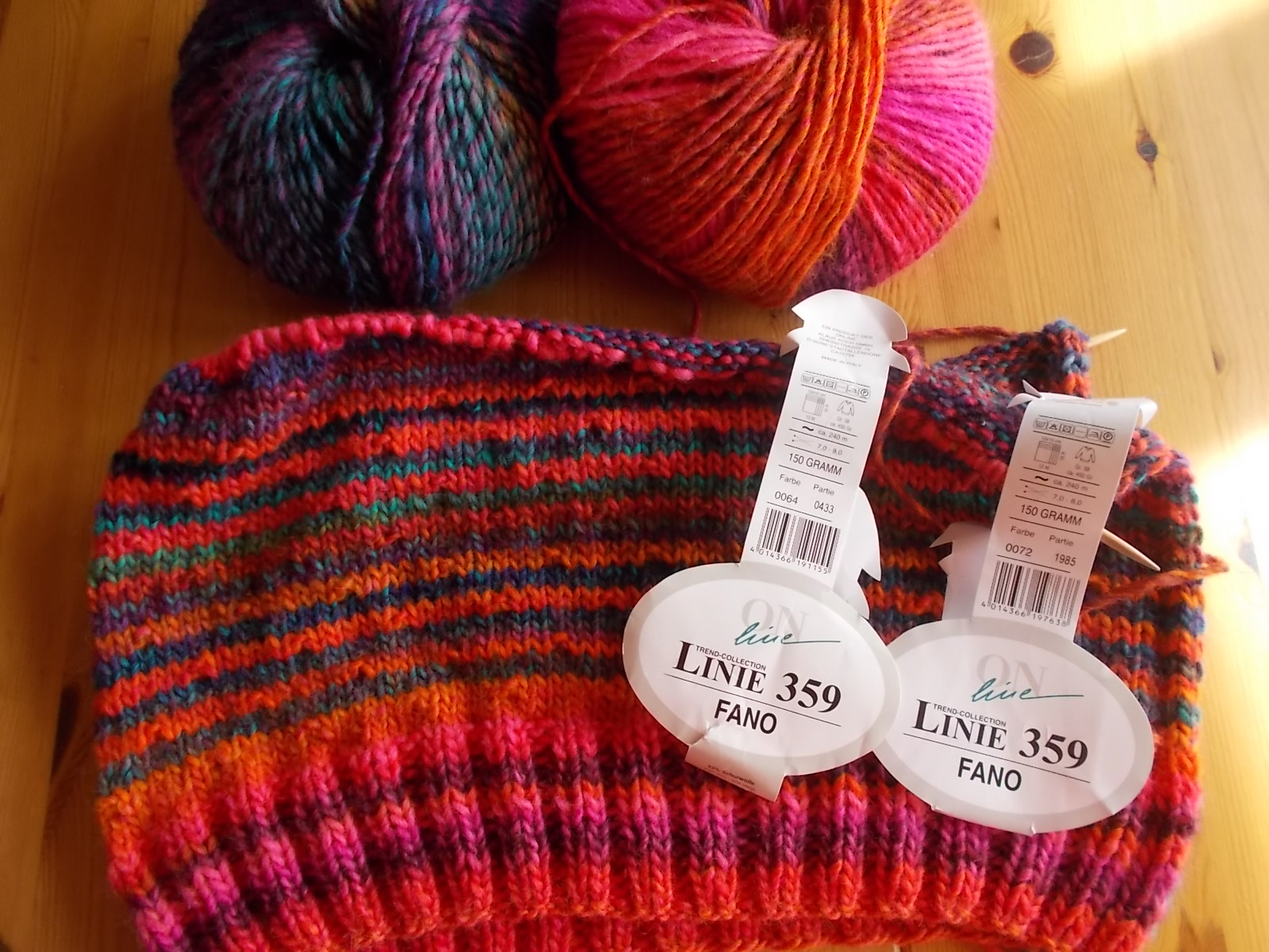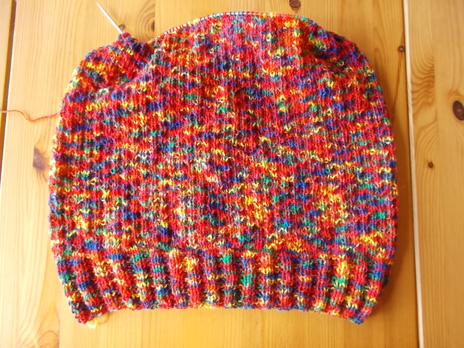Außerdem stricke ich an einem Pullover aus bunter Sockenwolle für Linja. So sieht das bis jetzt aus: