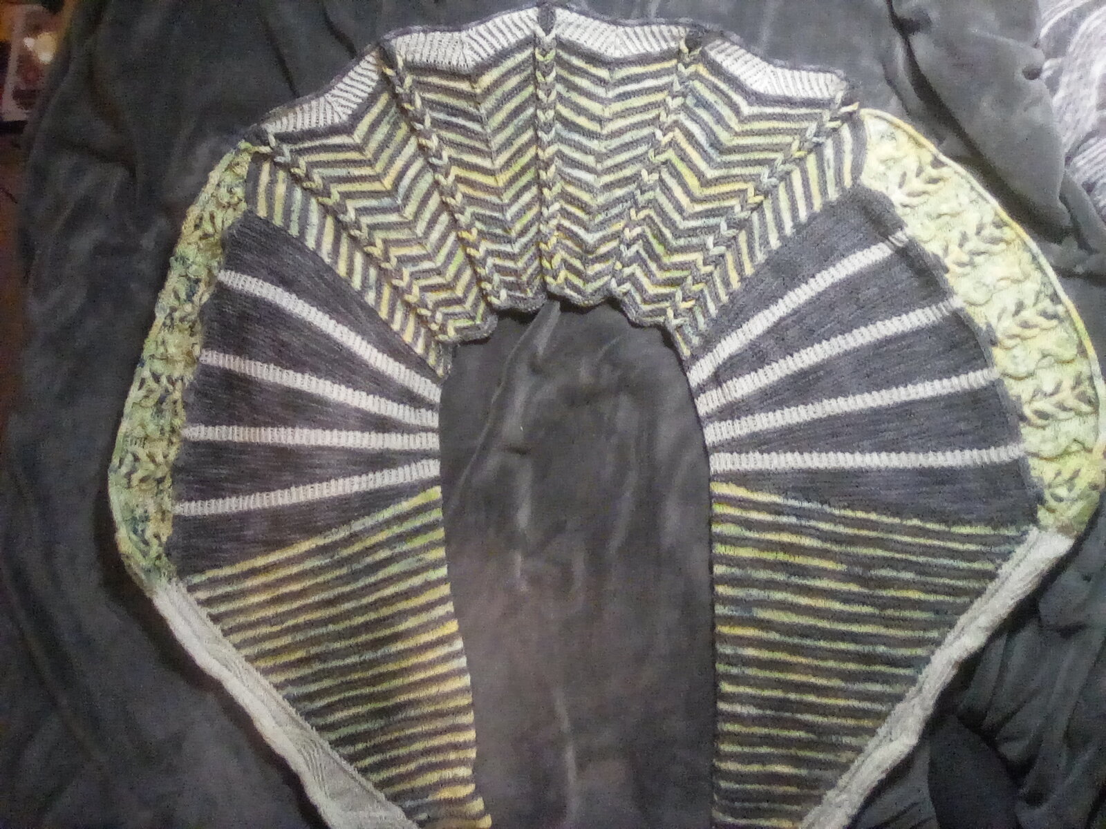 So, nun kann ich auch mal wieder was zeigen. Der Seelenwärmer ist endlich fertig und trägt sich sehr angenehm. Kuschlig warm ist er. Hab zu den zwei Knäueln (von Ruth und Ina) nur noch ein halbes weiteres gebraucht. Vielleicht strick ich noch Bündchen an die Armlöcher, mal sehen. Mir gefällt er aber so auch schon gut.