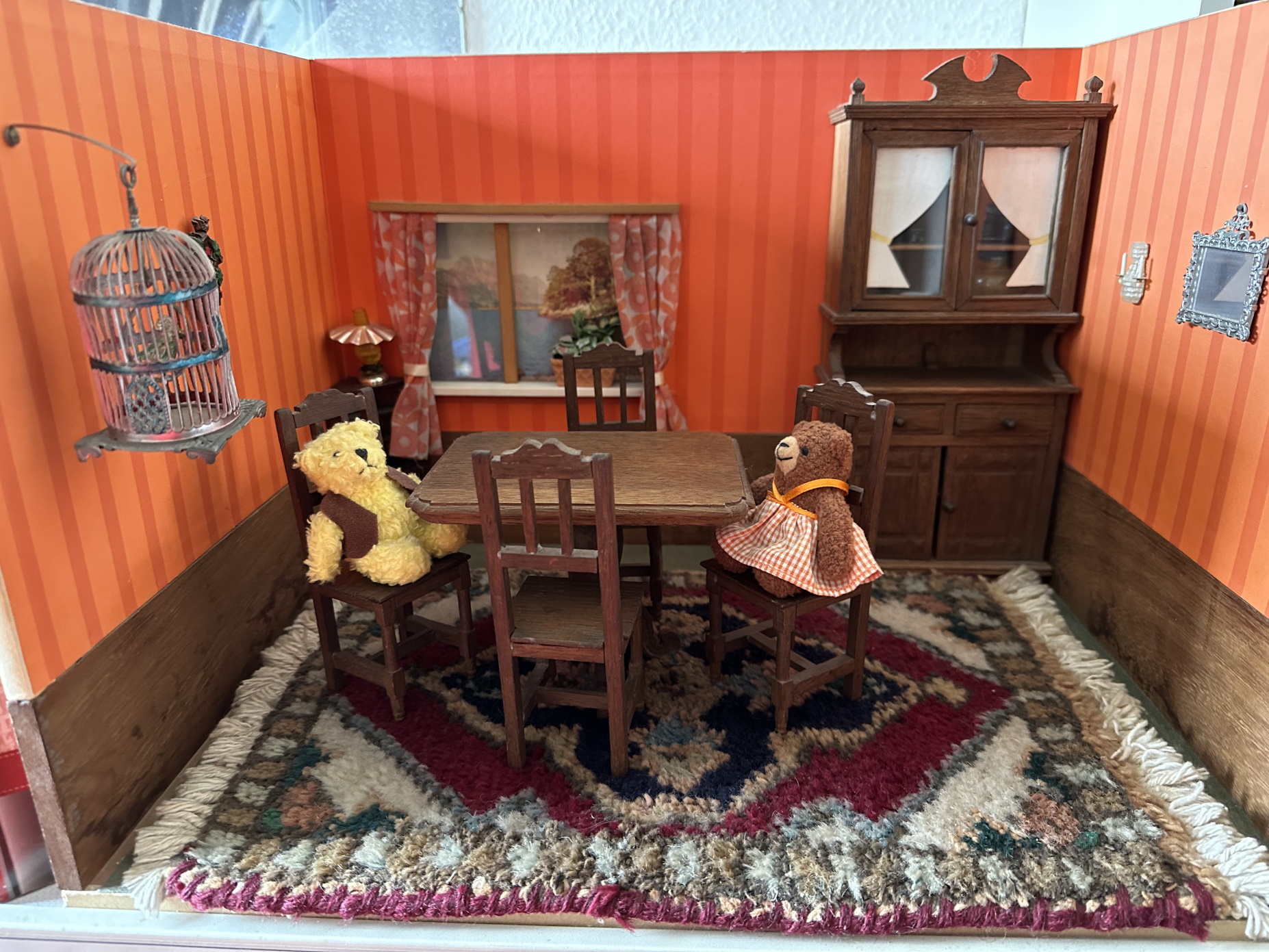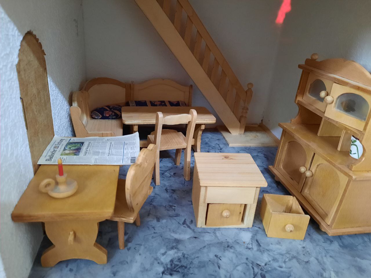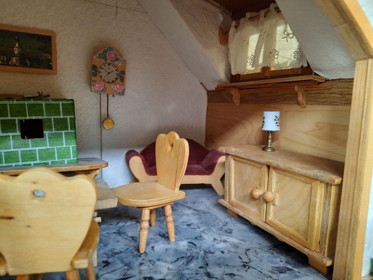 Ich hab eben entdeckt, dass ich davon Fotos auf dem Handy habe und möchte es euch zeigen. Ich möchte dazu erwĂ€hnen, dass jedes einzelne Teil in liebevoller Handarbeit selbst gemacht wurde. Jede einzelne Dachschindel, jedes MöbelstĂŒck,.. alles ist selbst gemacht. Sogar tapeziert hat er es!