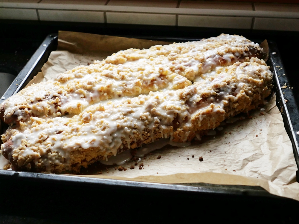 So ein Mohnzopf (Hefekuchen) füllt das ganze Blech aus und man kann ihn auch gut einfrieren. Wenn er noch lauwarm ist, schmeckt er am besten. Den Mohn mahle ich vorher selbst in der Kaffeemühle, dann ist er viel aromatischer. In die Mohnmasse kommt immer noch ein bisschen Marzipan oder ein paar Rosienen. Und die Streusel rühre ich mit Zitronensaft an.
