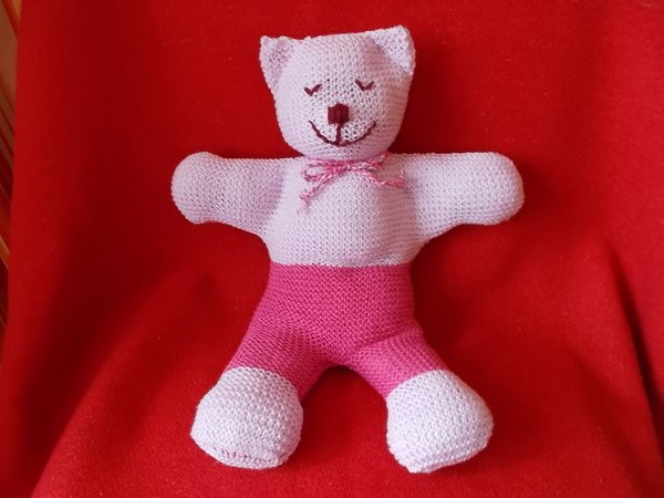 Dieses Kuschelbärchen kannst du für ein Kleinkind oder Baby stricken, auch wenn du noch Strickanfänger bist. Es geht ganz einfach und du brauchst dafür nur ein paar Baumwollreste und Füllwatte. Dann ist das Bärchen auch in der Waschmaschine waschbar. Das Gesicht wird am Ende aufgestickt.