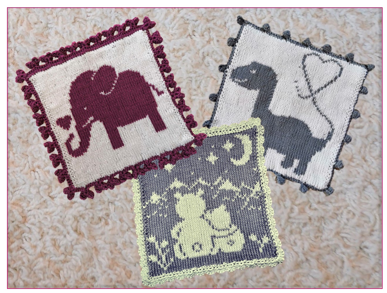 Kleine Kinder freuen sich über diese bezaubernden Kuschelbärchen, Elefant und Dino - sie können als Schmusetuch oder natürlich auch als Waschlappen verwendet werden. Durch die Doubleface Stricktechnik sehen die kleinen Tücher von beiden Seiten schön aus und sind ganz glatt. Genau das Richtige für zarte Kinderhaut! Alle Anleitungen gibt es auch einzeln in meinem Shop.