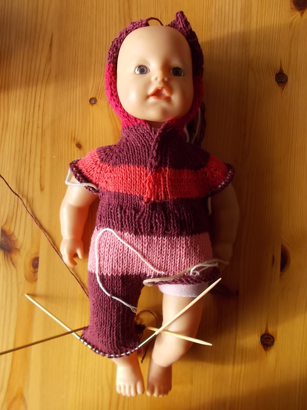 Ich kleide gerade das zweite Puppenbaby mit einem Winter-Overall ein. Das dritte wartet schon ungeduldig und kommt auch noch dran.