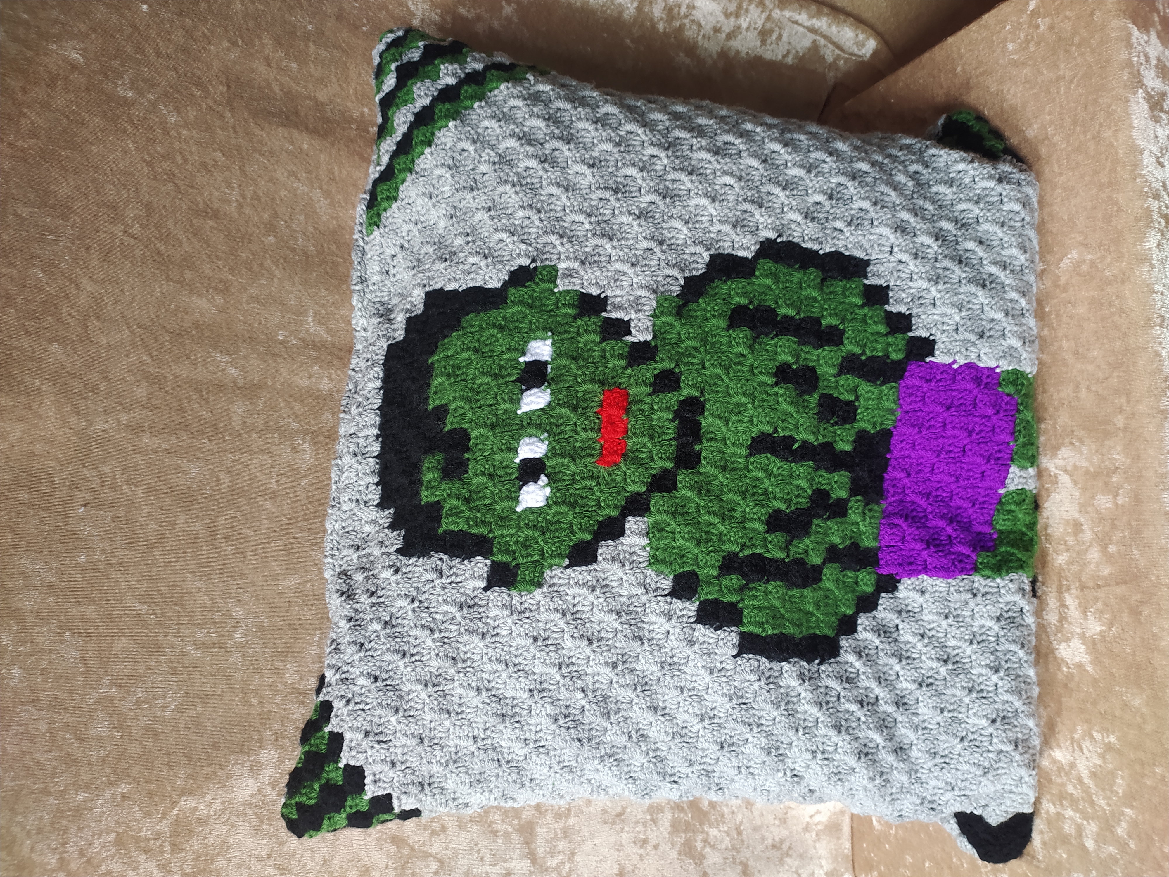 Eine Steigerung ist dann nochmals ein Bild zu Häkeln. Hier habe ich ein Kissen mit einem Hulk für meinen Sohn gehäkelt.