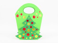 Die hübsche weihnachtliche Geschenktasche mit den geschmückten Tannenbäumchen auf beiden Seiten, wird aus Fotokarton gefertigt und mit Kreisen aus Hologrammfolie dekoriert. Sie ist ca. 22 x 25,5 x 9 cm groß und lässt sich schnell und einfach nacharbeiten.