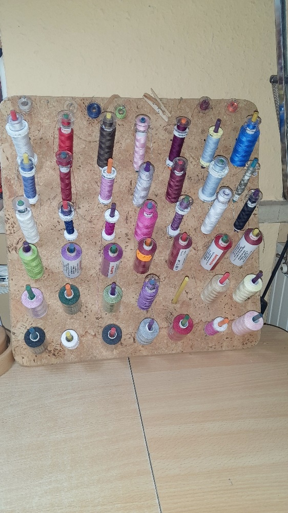 ich danke Euch für Eure Vorschläge und Bilder. Jeder muss so das für sich finden, was zu seinen Gegebenheiten passt. Da meine Nähmaschine im Spitzboden steht und ich dort nur schräge Wände habe, kann ich mir nix an die Wand machen. Das wäre natürlich schön, weil man sofort alles sehen kann wie bei Inge oder Petra.